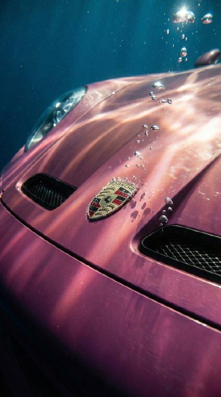 : A close-up of the logo on a lowered pink Porsche, taken from a reference image positioned in deep blue ocean water. The logo's surface is wet and glossy, with fine air bubbles and distinct highlights. Traces of small, distinct air bubbles lazily rise from under the hood. Dynamic, shimmering rays of sunlight dance and ripple across the car. The lighting is dramatic and atmospheric, with deep shadows, clean overhead lighting, and tiny particles in the water creating ambiance. High-quality cinematic look, ultra-detailed, 4K, vertical aspect ratio 9:16, photorealistic, no text Промпт для видео по этой же картинке в Kling: This cinematic underwater slow-motion video, shot on a pink Porsche 911 GT3, is mostly motionless in the deep blue ocean. The camera moves in incredible slow motion, filmed handheld. Dynamic, shimmering rays of sunlight realistically dance and shimmer across the pink hood and roof. Trails of tiny, distinct air bubbles lazily and slowly rise from the rear. The lighting