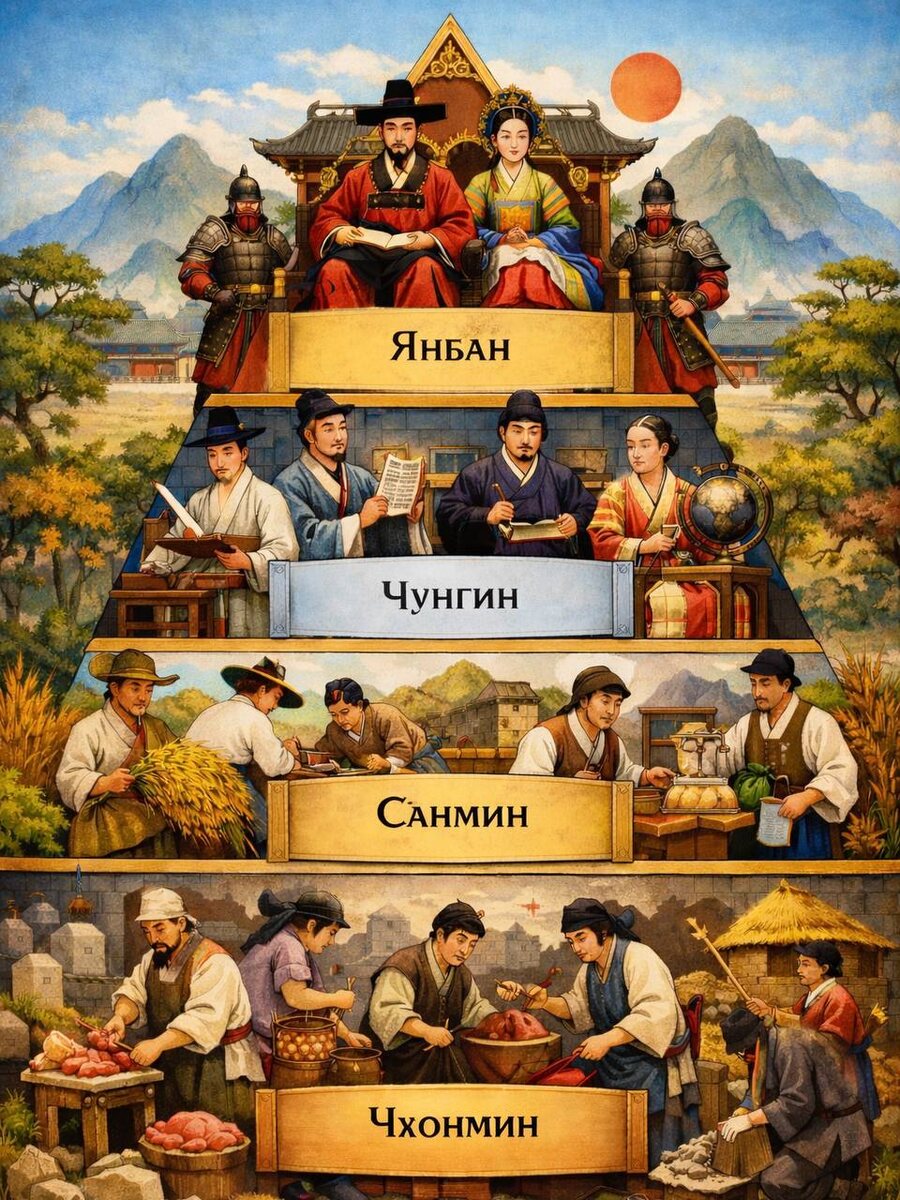 Сегодня 11-я статья Конституции Республики Корея утверждает, что все граждане равны перед законом. Однако это положение стало актуальным не так давно. На протяжении большей части своей истории корейцы принадлежали к социальным структурам. Например, в период Силла существовала система костного ранга, а во времена династии Чосон общество основывалось на неоконфуцианских идеалах. Чосон часто представляют как страну гармонии, но если копать глубже за внешней упорядоченностью скрывалась одна из самых жёстких социальных систем Восточной Азии. Общество было устроено без иллюзий на «социальный лифт». Статус человек получал при рождении и практически всегда носил его с собой до конца жизни. Социальная пирамида состояла из четырёх очерченных слоёв. На вершине находились янбан – правящая элита и носители власти, которых было не больше одной десятой части населения. Ниже располагались чунгин или «средние люди»: образованные специалисты, без которых система не могла функционировать, но к высшей