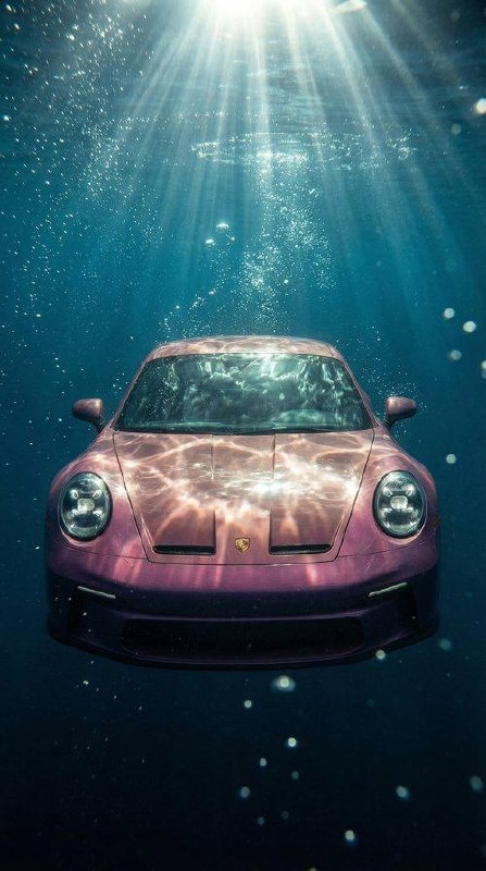 : A wide-angle, frontal shot, as if the car is submerged underwater. The Porsche's body is sharp and detailed, with realistic reflections. Tiny air bubbles float around the car, and barely noticeable scratches are visible on the body. Bright sunlight falls from the water's surface, creating a blue-green diffused light, cinematic contrast, shallow depth of field, and a bokeh effect in the background. Hyper-detailed, 4K, 9:16 vertical aspect ratio, photorealistic, no text. Промпт для видео по этой же картинке в Kling: This cinematic underwater slow-motion video, shot on a pink Porsche 911 GT3, is mostly motionless in the deep blue ocean. The camera moves in incredible slow motion, filmed handheld. Dynamic, shimmering rays of sunlight realistically dance and shimmer across the pink hood and roof. Trails of tiny, distinct air bubbles rise lazily and slowly from behind. The lighting is dramatic and atmospheric, with deep shadows. High-quality underwater footage in 8K.
