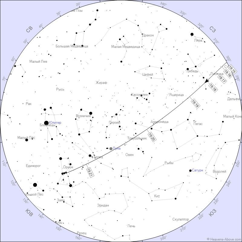 С 19:16 по 19:21 Если повезёт с погодой... Восходит: 19:14:46. Азимут: 299° (3C3) Достигает высоты 10°: 19:16:52. Азимут: 297° (3СЗ) Максимальная высота (74 градуса): 19:20:13. Азимут: 213° (ЮЮЗ). Блеск: -3,7 Входит в тень Земли (высота 34гр.): 19:21:33. Азимут 134° (ЮВ) Блеск: -2,9 Траектория полета пройдет через созвездия: Лисичка, Лебедь, Ящерица. Максиму блеска достигнет в Андромеде. Затем пройдет через Треугольник и приблизиться близко, к Луне. Далее траектория пройдет рядом с альфой Тельца, красавицей Альдебараном, и зайдет в тень Земли в поясе Ориона. #астрономия #наблюдения #МКС