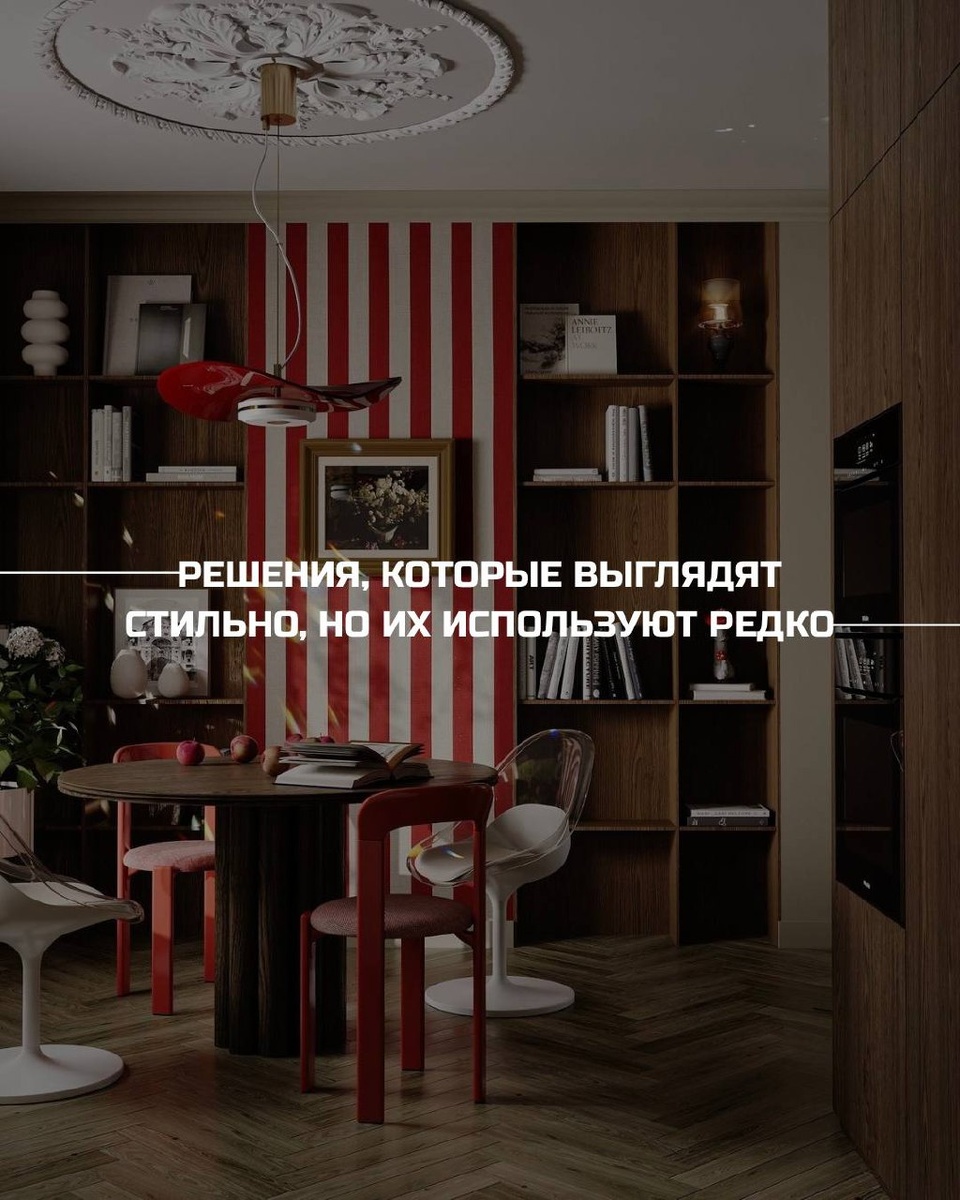 ➡️ Есть приёмы, которые не стремятся быть заметными, но именно они формируют характер интерьера и делают его визуально интересным. Ниже - четыре таких решения. 🔜 Акцентная ниша в ванной. Ниша может быть не просто функциональной, а композиционной. Свет, глубина и материал делают её частью архитектуры пространства. Такое решение добавляет ванной выразительность, не перегружая интерьер лишними деталями. 🔜 Простые шкафы снаружи, но яркие внутри. Снаружи - спокойный, нейтральный объём. Внутри - цвет, который задаёт характер. Контраст работает на ощущение уровня и индивидуальности в повседневном использовании. 🔜 Стеллаж за диваном. Стеллаж за диваном формирует второй план, добавляет глубину и собирает композицию комнаты. Пространство сразу становится сложнее и интереснее, если правильно рассчитаны глубина и масштаб. 🔜 Зона сна в нише за шторой. Ниша со шторой - это не про «спрятаться», а про сценарии. Днём - единое пространство, вечером - камерная зона отдыха. Такое решение добавляет