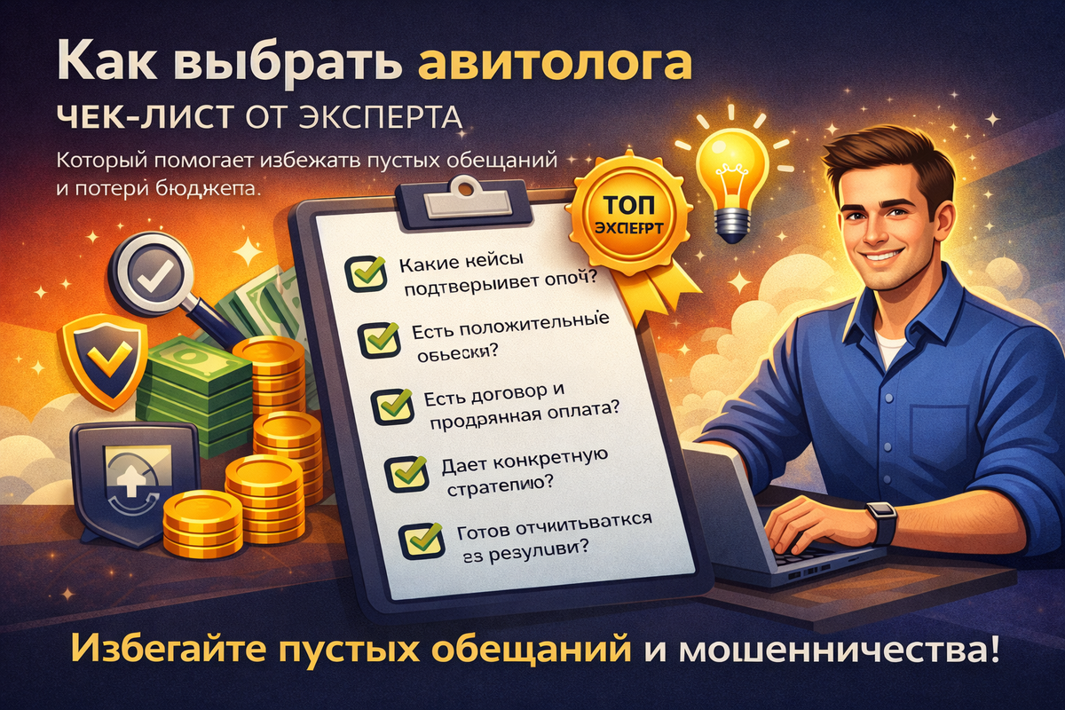 Как не слить бюджет и не потерять время? Как практикующий авитолог, я собрал чек-лист, который поможет выбрать специалиста осознанно и избежать самых распространённых ошибок. 🚩 Тревожный сигнал: «Гарантирую 100 заявок», «Выведу в ТОП за 3 дня», «Авито — это просто» Настоящий специалист понимает: ✅ Профессиональный авитолог объясняет: Если вам сразу предлагают: …без анализа — это повод насторожиться. 📊 Грамотный авитолог сначала: Без этого продвижение — слепая трата бюджета. Авито регулярно обновляет алгоритмы, и методы, которые работали год назад, сегодня могут не давать результата. Проверьте: 💡 Авитолог — это не “нажиматель кнопок”, а аналитик и стратег. Профессиональный специалист в