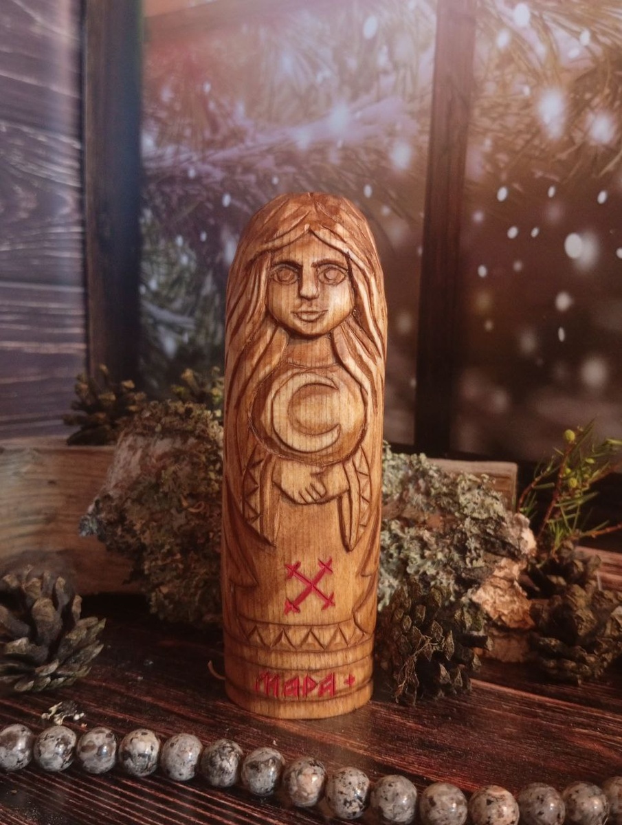 Представляю вам новый кумир — Мара, богиня перехода, покоя и очищения, вырезанная из цельного массива липы. Особенности образа: • На груди — полумесяц, подобный серпу, как символ завершения циклов и начала нового • Имя и символ подчеркнуты акрилом, добавляя яркости и сакральной глубины • Рост — 15 см, удобный размер для алтаря, полки или особого уголка в доме Каждый штрих проработан вручную, а покрытие из морилки и льняного масла сохраняет тепло и естественную энергетику дерева. Эта Мара — не о страхе, а о мудром принятии, не о конце, а о тихом переходе. #Мара #Кумир #СлавянскаяМифология #РезьбаПоДереву #ДеревяннаяСкульптура #Оберег #БогиняПерехода #Липа #РучнаяРабота 👇 Хотите такую Мару в свой дом? Пишите в личные сообщения — она ищет своего хранителя.