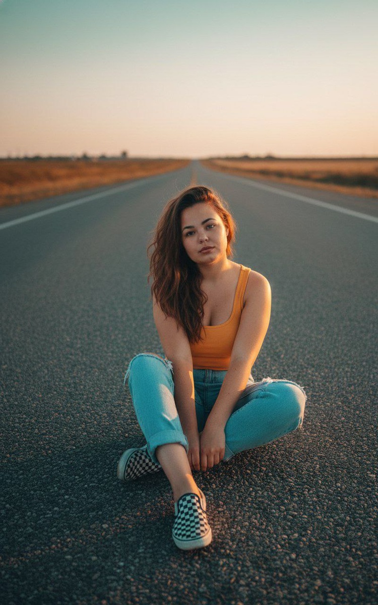 : 😀Заходим в этот бот или в этот 😀Выбираем "нейросети" 😀Нажимаем "Nano Banana" 😀Нажимаем "Nano Banana Pro" 😀Прикрепляем через скрепку свое фото и выбранный промпт 😀Наслаждаемся результатом😍 Создай фотореалистичное фото, не меняя черты лица. Молодая женщина сидит в середине пустой прямой шоссе, ноги в расслабленной позе, руки между коленями; низкий угол съёмки, центр композиции, ведущая линия дороги уводит взгляд к далёкому горизонту. Время — золотой час/закат, тёплое боково-заднее освещение с лёгким контровым ореолом по волосам. Одежда: жёлтый топ-майка, светло-голубые рваные джинсы с закатанными штанинами, чёрно-белые клетчатые слипоны; длинные тёмные волнистые волосы, естественная поза и выражение тела. Стиль — кинематографичная лайфстайл-фотография, мягкая глубина резкости, размытый фон, текстура асфальта чёткая, тёплая цветокоррекция в стиле teal orange, лёгкая плёночная зернистость, небольшая виньетка. Камерные параметры: эквивалент 50–85 мм, диафрагма f/1.8–f/2.8, ISO 10