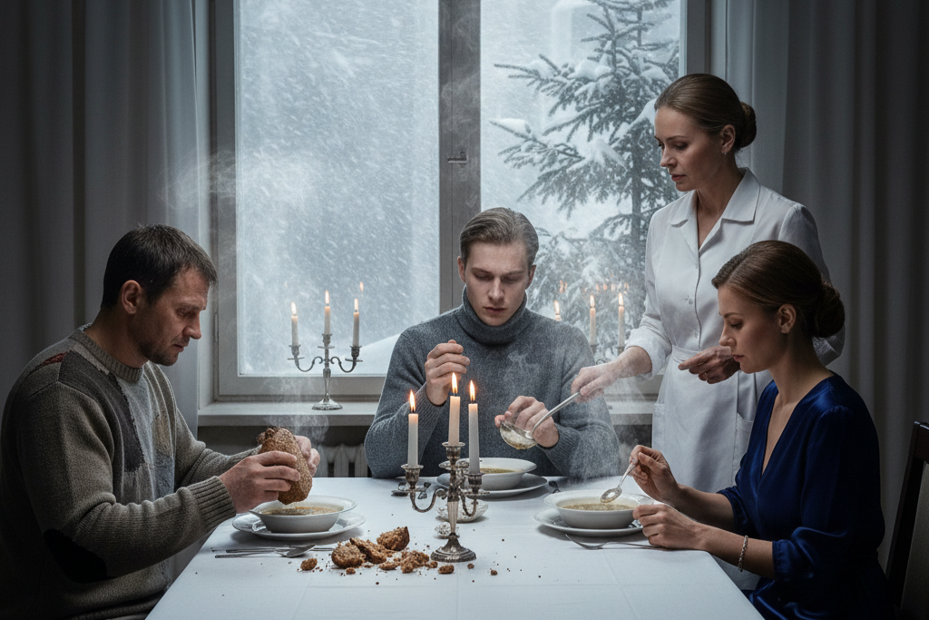Марина выравнивала ножи. Расстояние от края стола до черенка — ровно два сантиметра. Она не пользовалась линейкой, глаз пристрелян за тридцать лет. Белая скатерть была накрахмалена так сильно, что казалась вырезанной из гипсокартона. Входная дверь хлопнула. Сквозняк на мгновение качнул пламя свечей, и Марина поморщилась. Порядок — это тишина. Сквозняк — это хаос. Артём стоял в дверях кухни. От него пахло мокрой шерстью, дешёвым табаком и чем-то кислым, въевшимся в поры за пять лет. Он не решался сделать шаг на плитку, будто она была заминирована. — Привет, мам. Марина не подняла головы. Она заметила, что на тарелке Кирилла лежит ворсинка. Она взяла её двумя пальцами, поднесла к свету и только потом аккуратно стряхнула в ладонь. — Руки помыл? — голос был ровным, как гладь замерзшего пруда. — Помыл. На заправке ещё. Артём шагнул к столу и потянулся к стулу у окна. Своему стулу. — Сядь на место отца, — Марина наконец посмотрела, но не в лицо сыну, а на его ботинки. На полу остался влажный