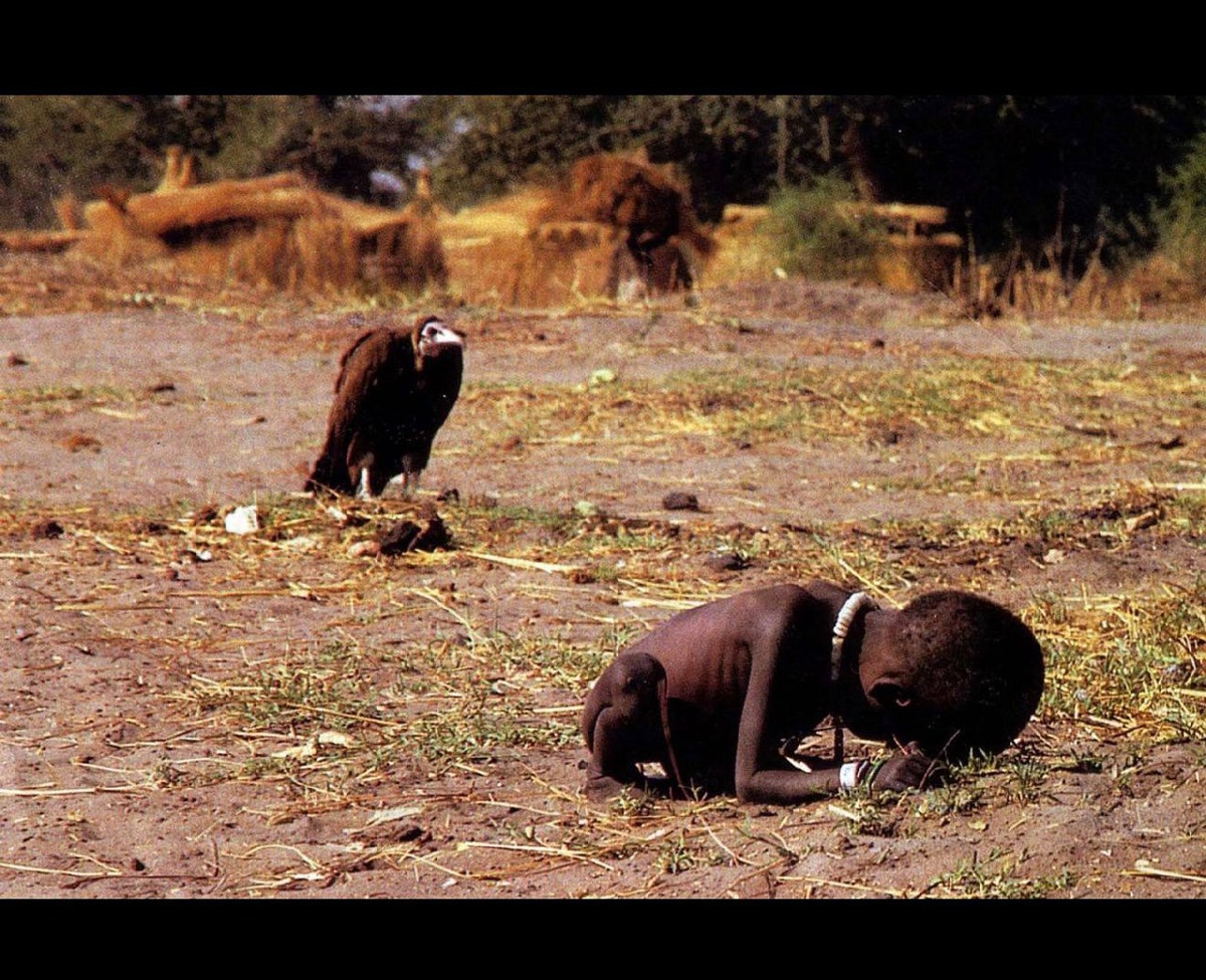 Ребёнок на земле. В нескольких шагах — стервятник. Не нападение. Не кровь. Просто пауза. Тишина. И чувство, что время остановилось. Снимок сделали во время голода в Судане в начале 90-х. Ребёнок (важный момент: его часто называли «девочкой», но позже выяснилось, что это был мальчик) остановился по пути к пункту, где раздавали еду. И в этот момент фотограф нажал кнопку. Фотографа звали Кевин Картер — южноафриканец, военный фотокорреспондент. Он снимал не «красивые путешествия», а то, от чего отворачиваются: насилие, бедность, смерть, человеческую жестокость. И, как это часто бывает, такая работа не проходит бесплатно — она остаётся в голове навсегда. Когда фото вышло в мировых СМИ, мир взорвался… но не голодом, а вопросом: “А он помог ребёнку или просто снял?” Картер говорил, что прогнал птицу. И всё равно его начали рвать на части: — «Герой! Показал правду — благодаря таким кадрам приходят деньги и помощь!» — «Нет. Это мародёрство. Камера вместо руки — это предательство!» В 1994