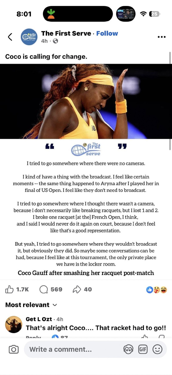 🎾 💬 «Я пыталась уйти туда, где нет камер. У меня есть кое-что с трансляцией. Мне кажется, что некоторые моменты не нужно транслировать. Я сломала одну ракетку на Открытом чемпионате Франции, и сказала, что больше никогда не буду этого делать на корте, потому что не думаю, что это хорошее представление. Я пыталась уйти туда, где, как мне казалось, не было камеры, потому что мне не нравится ломать ракетки, но я проиграла 1 и 2. Я попыталась уйти туда, где бы это не транслировали, но, очевидно, они это сделали. Так что, возможно, стоит поговорить, потому что мне кажется, что на этом турнире единственное личное место, которое у нас есть, — это раздевалка». Подпишись на Эйс и точка