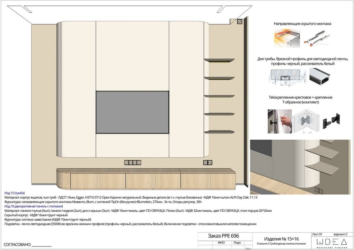 Здесь вся композиция выстроена вокруг плавной кривой: радиусные боковины, скругленная линия фасадов, сопряжение с вертикальной панелью и открытыми полками. (см. рис. 1). По чертежам хорошо видно, что радиус задан не только по фасаду, но и по корпусу: гнутые детали идут через всю глубину изделия. Это потребовало отдельного расчета раскроя и последующей подгонки на этапе сборки. Нижний блок конструкции решен как визуально легкая линия хранения: выдвижные ящики на скрытых направляющих, с равномерным ритмом фасадов и точной посадкой по высоте. Важно, что радиус сохранен и в нижней части — без обрывов и прямых торцов (см. рис. 2). Отдельного внимания заслуживает декоративная панель с полками: полки «врезаются» в радиусную часть, подсветка интегрирована во врезной профиль и работает как мягкий контур. Дальше будем разбирать остальные изделия этого проекта — по той же логике: от чертежа к реализованной форме.