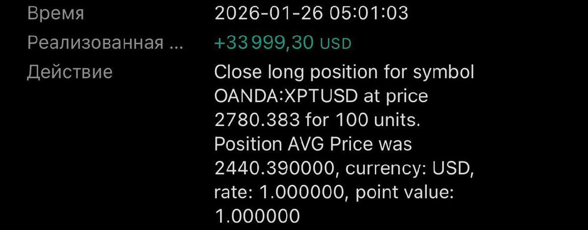 🏆 XPT/USD: Идеальная отработка на +$33 999 (2 часть) 21 января я давал вам сценарий по Платине. Мы ждали завершения коррекции и входили на пробое уровня сопротивления 2530. Что имеем по факту? Рынок отработал филигранно. Цена пробила уровень, дала импульс и ударила ровно в нашу цель 2780, полностью закрыв движение. 📊 Математика сделки: • Вход: Пробой 2530 • Тейк-профит: 2780 • Результат: +$33 999,30 чистой прибыли (см. первый скрин). Это пример того, как работает терпение и технический анализ. Не гадали, дождались условий, забрали свое. Всех, кто заходил по идее — с профитом! 🤝