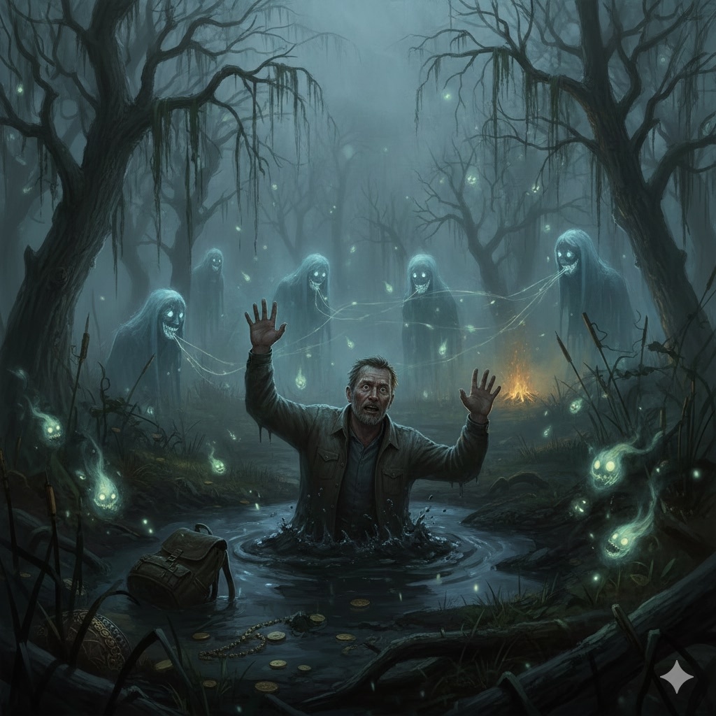 Наутро, когда солнце показалось над горизонтом, болото снова стало спокойным и тихим. Лишь холодный туман, медленно рассеиваясь, оставлял за собой ощущение неизъяснимого ужаса. А где-то в глубине топи, среди мха и гниющих листьев, покоились новые сокровища – пустые обещания и ещё одна потерянная душа.