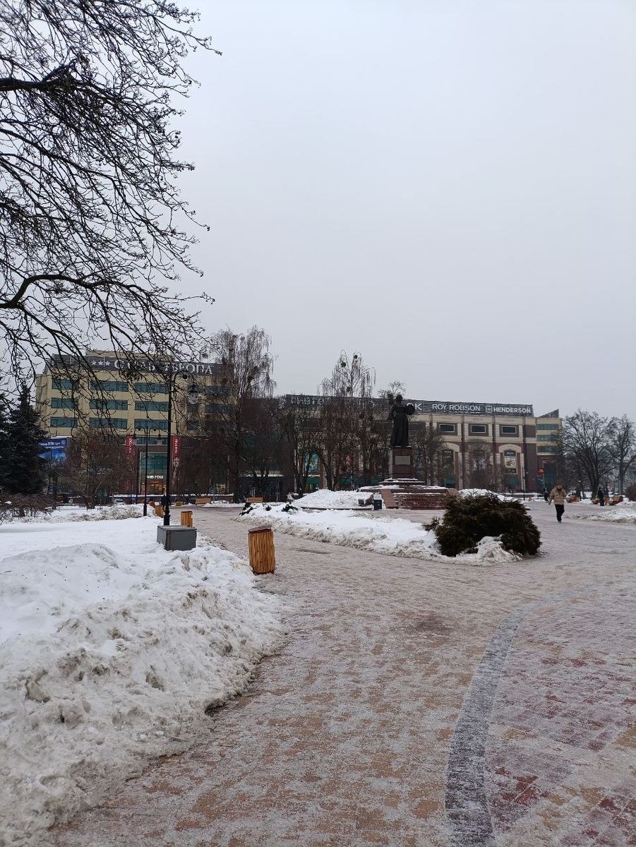 И тем, что уже почти месяц она холодная и снежная. Ну холод -понятие относительное. Для Калининградской области если столбик термометра ниже нуля-это холодно. Сегодня 27 января - минус 3. Но рано радоваться, мороз опять наступает. А вчера шёл дождь. Странно правда, минус на градуснике, и идёт дождь. В результате весь город превратился в один большой каток. А мне сегодня необходимо было поехать в Калининград. Хотела даже отменить поездку. Выезжала из Правдинска утром, в девять часов. Все тротуары центральные уже были обработаны, самое непроходимые место-это мои сто метров, как всегда. В Калининграде тоже коммунальщики всё обрабатывают в центре города оперативно. На фото видно зелененькую машинку, она чем-то поливает площадь около ТЦ Европа. Наверно солевой раствор. Конечно, на окраинах города и во дворах не так всё оперативно. Очень скользко.