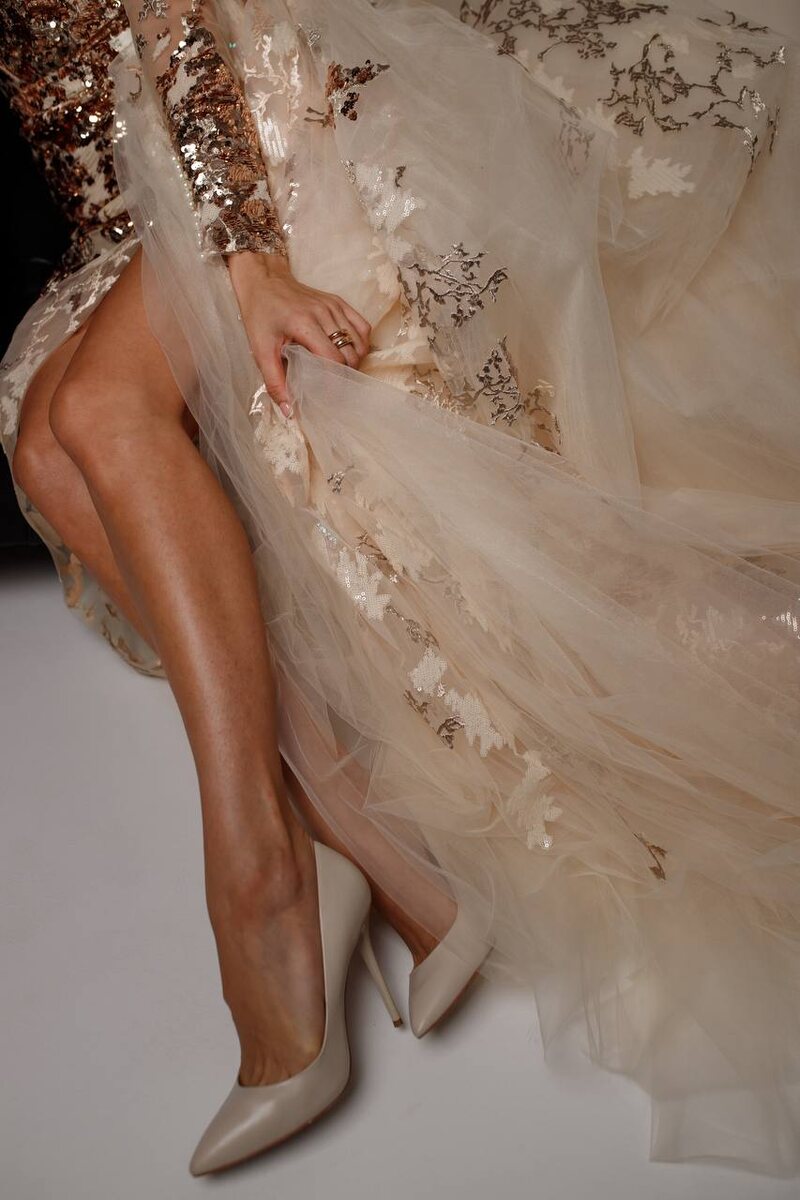 🤩 🌟Главная особенность: съёмный пышный шлейф (1 м), расшитый кружевом. Драма на церемонии — легкость на празднике. 🌟Детали: цвет айвори, итальянская сеточка с вышивкой абстрактным кружевом (пайетки, шелк). 🌟Форма: удлиненный прозрачный корсет подчеркнёт талию, прямой рукав с роскошной вышивкой. Идеальный баланс сдержанного кроя и эффектных акцентов.