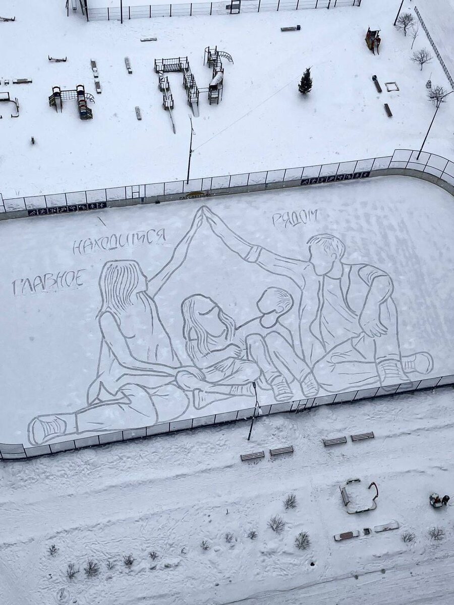В Екатеринбурге художник Леонид Валитов создал на катке в своем дворе впечатляющую картину, посвященную семье
