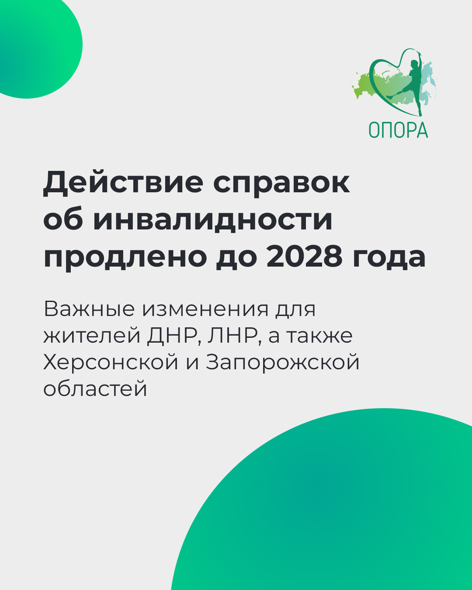 Жителям Донецкой и Луганской народных республик (ДНР, ЛНР), а также Херсонской и Запорожской областей продлят срок действия документов, устанавливающих инвалидность и степень утраты профессиональной трудоспособности. ❗️Согласно нововведениям, справки, выданные до 1 марта 2023 года и в которых не указан срок их действия, сохранят силу до 1 января 2028 года. В случае, когда срок действия справок истекает в период с 24 февраля 22 года до 31 декабря 2026 года, документы будут признаваться действительными до 31 декабря 2026 года. Кроме того, установлен переходный период до конца 2027 года, в течение которого группы инвалидности, присвоенные по прежнему законодательству, приравниваются к группам, установленным в РФ. Это позволит гражданам без перерыва получать все положенные меры социальной поддержки и пенсии. 🗣С чем связаны такие изменения? Ранее зампред Комитета Совфеда по социальной политике, сенатор от ЛНР Дарья Лантратова сообщила, что из 227 тысяч человек с инвалидностью из новых субъ