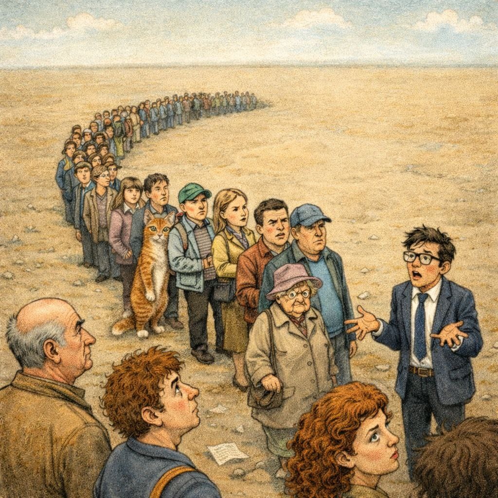 Неизвестно куда и неизвестно зачем, но всем надо. Задание 747: Напишите микро-рассказ из 7 слов или меньше (или больше), на тему "Очередь в никуда". Свои варианты пишите в комментариях к этому посту. Также на всякий случай даём прямую ссылку на чат https://t.me/litclubbs_flood *** Предложить свою тему для марафона можно сюда @yaroshdobryi