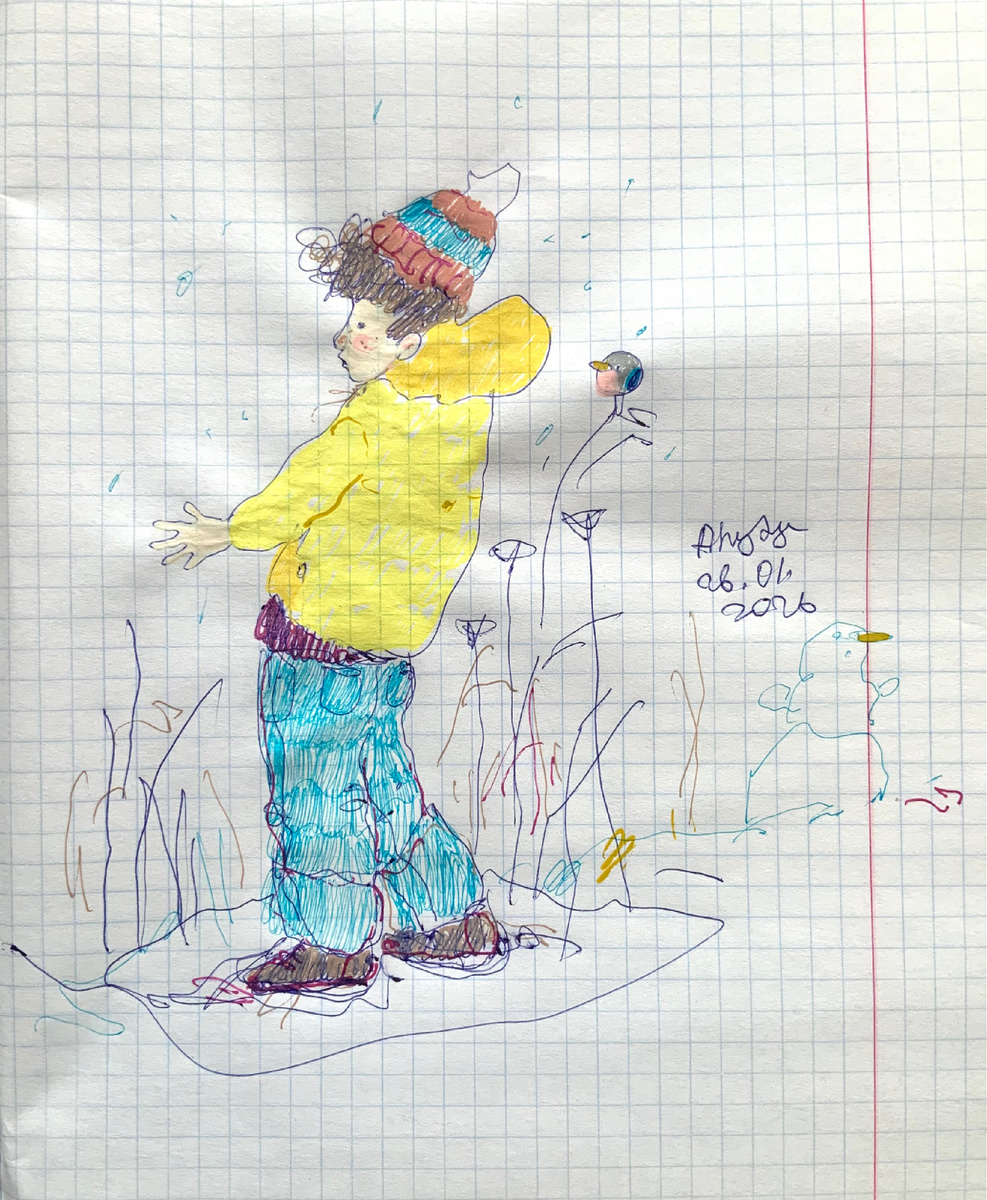 Ловят снег снеговик, мальчик и снегирь 🌾 🌬️ ❄️ 🧒🏼 🐥