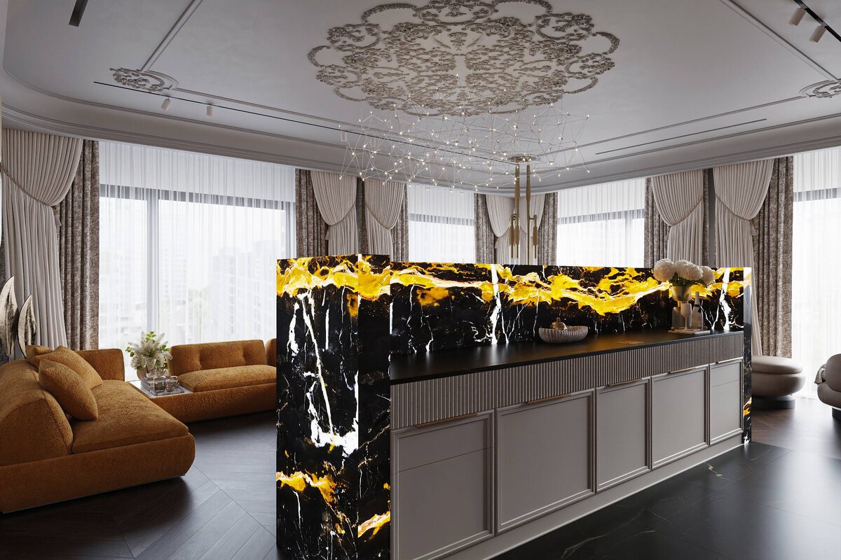 Самые классные фишки: • остров отгородили от гостиной, чтобы на ТВ не летели брызги и из гостиной не было видно грязной посуды. • чёрный оникс с подсветкой 🤩🤩 это, считаю, вообще просто ужас как красиво будет в живую! • задняя часть кухни закрывается створками. Створки со шпоном корня тополя. Оооочень дорого и интересно смотрится! • широчеееенный диван для всей семьи и гостей! • антикварная витрина для посуды Вообще, фишек и классных приемов здесь много, я описала самые очевидные. А что вам нравится в проекте больше всего?