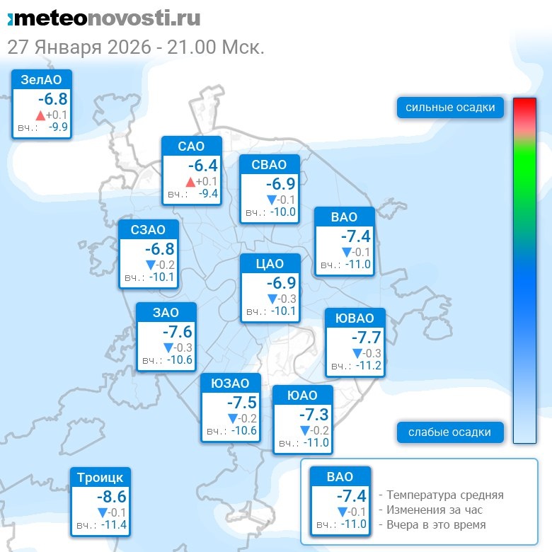 В 21:00 в Москве было от -8.8°C до -6°C, средняя температура -7.2°C #погода #Москва #зима #температура #27января #вторник