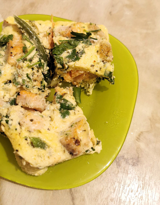 Хоягушт - это такая яичная запеканка. Традиционное блюдо горских евреев, проживающих в Азербайджане. Азербайджанцы же считают, что хоягушт - азербайджанское изобретение, а горские евреи его распробовали и переделали на свой лад. Название блюда говорит о его составе: "хоя" означает яйца, а "гушт" на персидском - мясо. Однако хоягушт может быть разным по составу продуктов, его готовят не только из мяса или курицы, но и из рыбы, и даже из овощей. Блюдо очень сытное, простое, но его часто готовят даже к праздничному столу. Сегодня на завтрак - хоягушт с лососем. На две порции: ✔ Яйца — 2 шт.; ✔ Лосось (филе, свежий или слабосолёный) — 120 г; ✔ Фасоль стручковая (свежая или замороженная) — 70 г; ✔ Брокколи — 70 г; ✔ Сливки 10-20% — 50 мл; ✔ Кинза свежая — 5 г; ✔ Чеснок — 1 зубчик; ✔ Соль, перец чёрный молотый — по вкусу; ✔ Масло для смазывания формы (опционально) — 2-3 г. Яйца взбить со сливками. Добавить стручковую фасоль, брокколи, кусочки лосося, кинзу, чеснок, перец и соль. Готовить в м