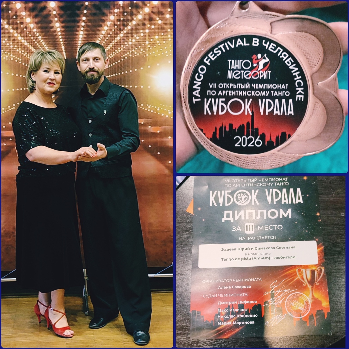 ! 🥉💃 В копилку спортивных и культурных достижений Шадринска добавилась ещё одна награда. На крупном турнире «Уральский метеорит» (г. Челябинск) наши танцоры взяли бронзу! ✨ Шадринский танго‑клуб в составе трёх пар отправился на паркет, где участники соревновались с опытными парами из Екатеринбурга, Челябинска, Магнитогорска, Питера, Москвы и других городов. Итог: заслуженное 3‑е место в номинации «Любители» заняла пара — Юрий Фадеев и Светлана Симакова. Особенно вдохновляет то, что ребята начали заниматься танго совсем недавно, но уже смогли показать высокий уровень мастерства, характер и настоящую страсть. Шадринск снова доказал: в нашем городе живут талантливые и целеустремлённые люди. Поздравляем победителей — пишите комментарии! 👇🎉