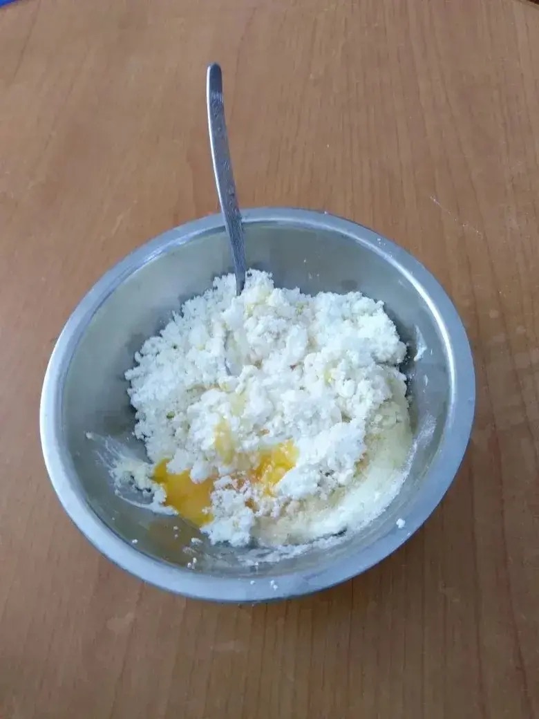 Творог смешать с яйцами, сметаной, манкой, сахаром, солью и разрыхлителем)