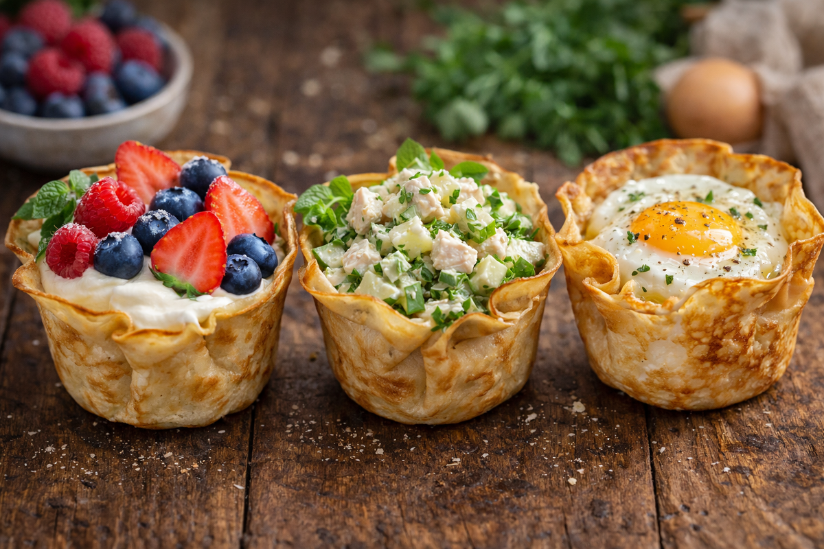 Получаются аккуратные блинные стаканчики, которые можно наполнять чем угодно — от десерта до полноценного завтрака или закуски.