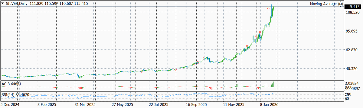 На этом канале в режиме реального времени делаем инвестиционные и трейдинговые / торговые сделки со среднесрочным горизонтом для проверки наших гипотез на дальнейшие движения рынка и чтобы заработать. С результатами за прошлые периоды можно ознакомиться здесь. Есть посты с информацией о входе в сделки, есть посты с информацией о выходе и результатах. ------------------------------ В дополнение к ранее открытым позициям по золоту и серебру от 14.07.2025, 08.09.2025, 02.10.2025, 08.10.2025, 17.10.2025, 22.12.2025, 06.01.2026 усиливаем: шорт по серебру от текущего уровня 115,4 с пятым плечом, шорт по золоту от текущего уровня 5240 с пятым плечом, шорт по платине от текущего уровня 2871 с пятым плечом, шорт по палладию от текущего уровня 2144 с пятым плечом. Все ранее открытые активные позиции по шорту золота и серебра удерживаем с добавлением депозита несмотря на текущие убытки.