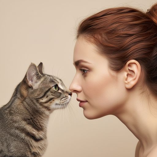 Нежный портрет в профиле: человек и [собака/кошка] нос к носу, крупный план.