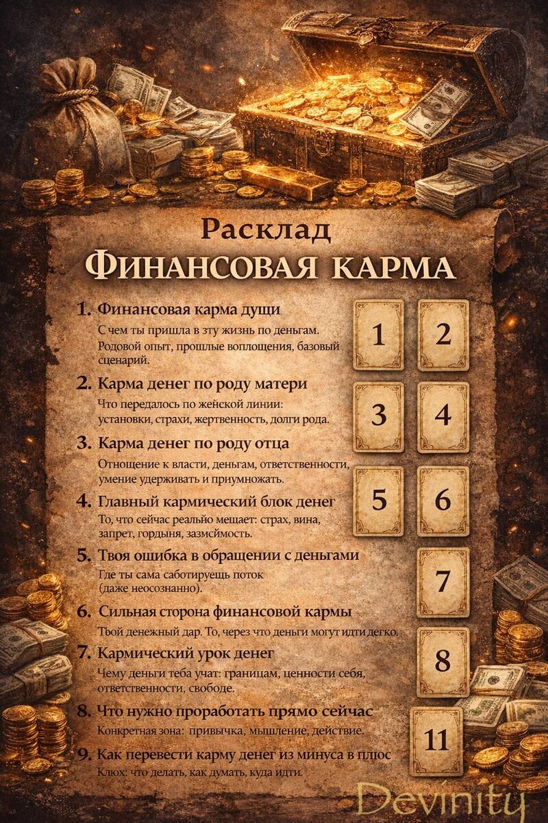 » Цель расклада: Понять, почему деньги в жизни идут именно так, где кармический затык, а где — ключ к изобилию. 1️⃣ Финансовая карма души С чем ты пришла в эту жизнь по деньгам. Родовой опыт, прошлые воплощения, базовый сценарий. 2️⃣ Карма денег по роду матери Что передалось по женской линии: установки, страхи, жертвенность, долги рода. 3️⃣ Карма денег по роду отца Отношение к власти, деньгам, ответственности, умение удерживать и приумножать. 4️⃣ Главный кармический блок денег То, что сейчас реально мешает: страх, вина, запрет, гордыня, зависимость. 5️⃣ Твоя ошибка в обращении с деньгами Где ты сама саботируешь поток (даже неосознанно). 6️⃣ Сильная сторона финансовой кармы Твой денежный дар. То, через что деньги могут идти легко. 7️⃣ Кармический урок денег Чему деньги тебя учат: границам, ценности себя, ответственности, свободе. 8️⃣ Что нужно проработать прямо сейчас Конкретная зона: привычка, мышление, действие. 9️⃣ Как перевести карму денег из минуса в плюс Ключ: ч