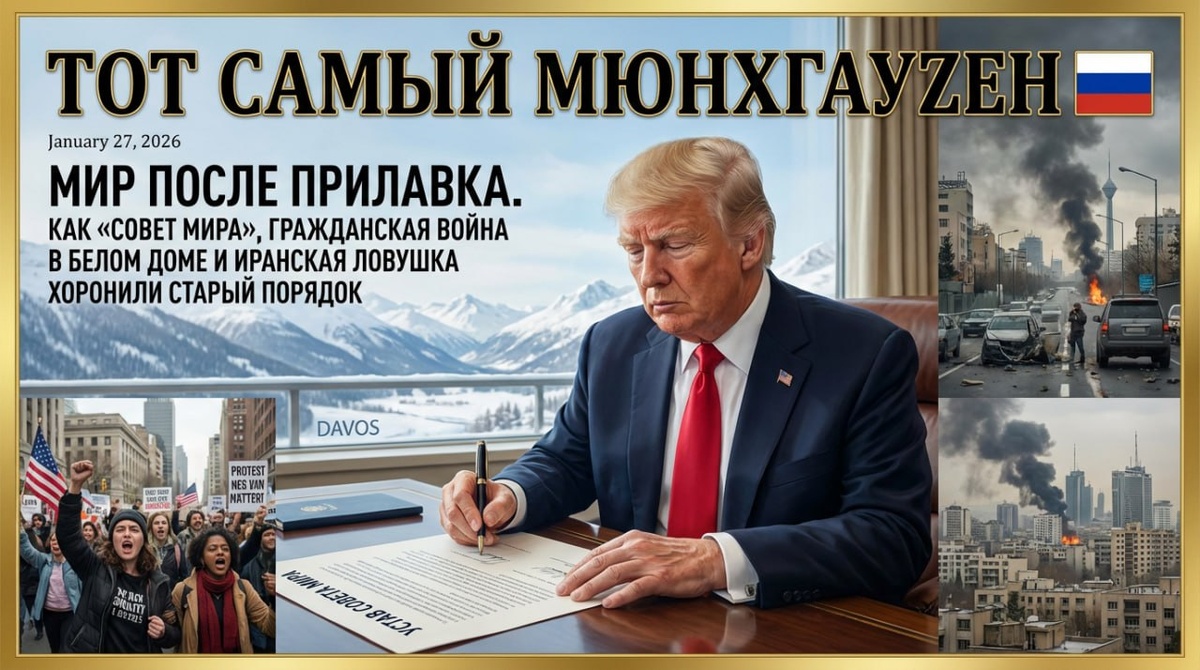 🚨 Колонка МюнхгауZена: Мир после прилавка. Как «Совет мира», гражданская война в Белом доме и иранская ловушка хоронили старый порядок Часть 4️⃣/4 🔮 Заключение: Год великого водораздела и холодная ясность России Итак, каков же итог первого месяца 2026 года? Мы становимся свидетелями Великого Водораздела. 1. Проект глобалистской империи США перешёл в терминальную стадию. Его агония проявляется в уродливых, фанерных проектах вроде «Совета мира», в гражданской войне элит и в неспособности предложить миру ничего, кроме новых угроз и старых долгов. 2. Трамповский проект «национальной Америки» оказался в стратегическом тупике. Он может разрушать (выход из организаций, санкции, угрозы), но не может созидать новую, привлекательную модель. Он заперт между глобалистами дома и неподъёмными вызовами вовне, а его внешняя политика сводится к серии рискованных, изолированных авантюр, не складывающихся в картину. 3. Наступает эпоха финансовой турбулентности и перераспределения влияния. Крах до