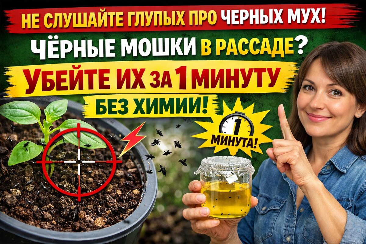 Не слушайте глупых про черных мух! Чёрные мошки в рассаде? Убейте их за 1 минуту БЕЗ ХИМИИ! (Игнорируйте советы «подсуши землю» и «посыпь табаком». Они не работают. Вот метод, который уничтожает мошек на всех стадиях: яйца, личинки, взрослые особи — БЕЗ ВРЕДА для рассады.) ❌ ВАС ВОДЯТ ЗА НОС! Вам говорят: «Это просто грибные комарики, они безвредны». ЛОЖЬ. Их личинки (мелкие белые червячки) жрут нежные корни вашей рассады, открывая ворота для гнилей. Слабая, синеющая рассада, которая не растет — часто их «работа». Главный секрет: Бороться только со взрослыми летающими мошками — бесполезно. Они уже отложили яйца. Нужен удар по всем фронтам одновременно. И это можно сделать за один раз. Это — основа. Всё остальное — полумеры. Пока горчица работает внизу, ловим тех, кто в воздухе. После обработки включите на 1-2 часа обычный вентилятор, направив слабый поток на рассаду. Мошки не переносят сквозняков, а для рассады это профилактика чёрной ножки и закалка стебля. Мошки не заведутся, если л