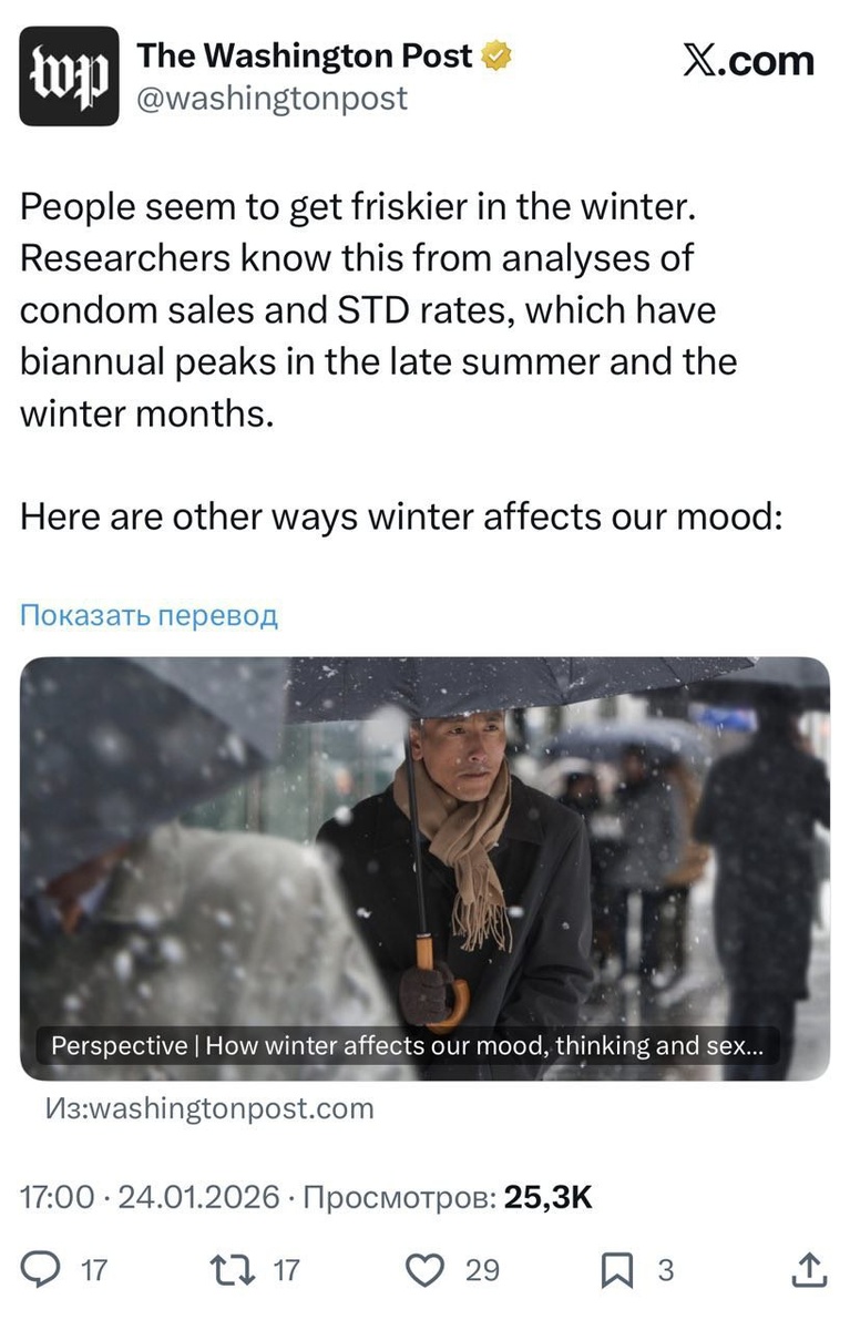 🧊🔥 Рубрика: Общество Зима — время для любви? Да, и это не просто романтический штамп. Исследования показывают, что холодные месяцы буквально подталкивают нас к сексуальным подвигам. Продажи презервативов взлетают, растёт заболеваемость ИППП, а трафик на «взрослых» сайтах бьёт рекорды. 🎯 Почему так происходит? Всё просто: эволюция. Зимой мы едим больше, двигаемся меньше — это механизм запаса энергии. Но вместе с этим растёт и либидо. Короткий световой день рушит циркадные ритмы, снижает уровень серотонина, но делает нас игривее. И, конечно, весной мы получаем буст рождаемости от зимних зачатий. 👶 А ещё зима делает нас умнее. Когнитивные функции улучшаются — легче фокусироваться на задачах. Так что если вы вдруг потолстели или стали чаще заниматься сексом, не переживайте. Вы просто эволюционируете. 🧬 #секс #зима #эволюция #ИППП #рождаемость Читать на сайте ➡️ Подписаться