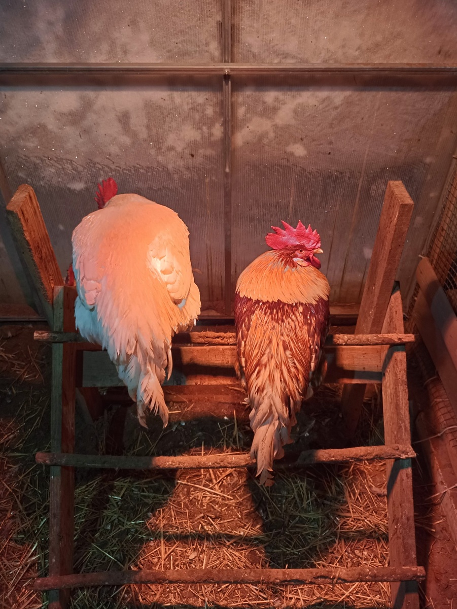 И после 15 января, после снегопадов, обещали резкое похолодание. Петухам повесил греющую инфракрасную лампу. Пусть им тоже будет тепло.