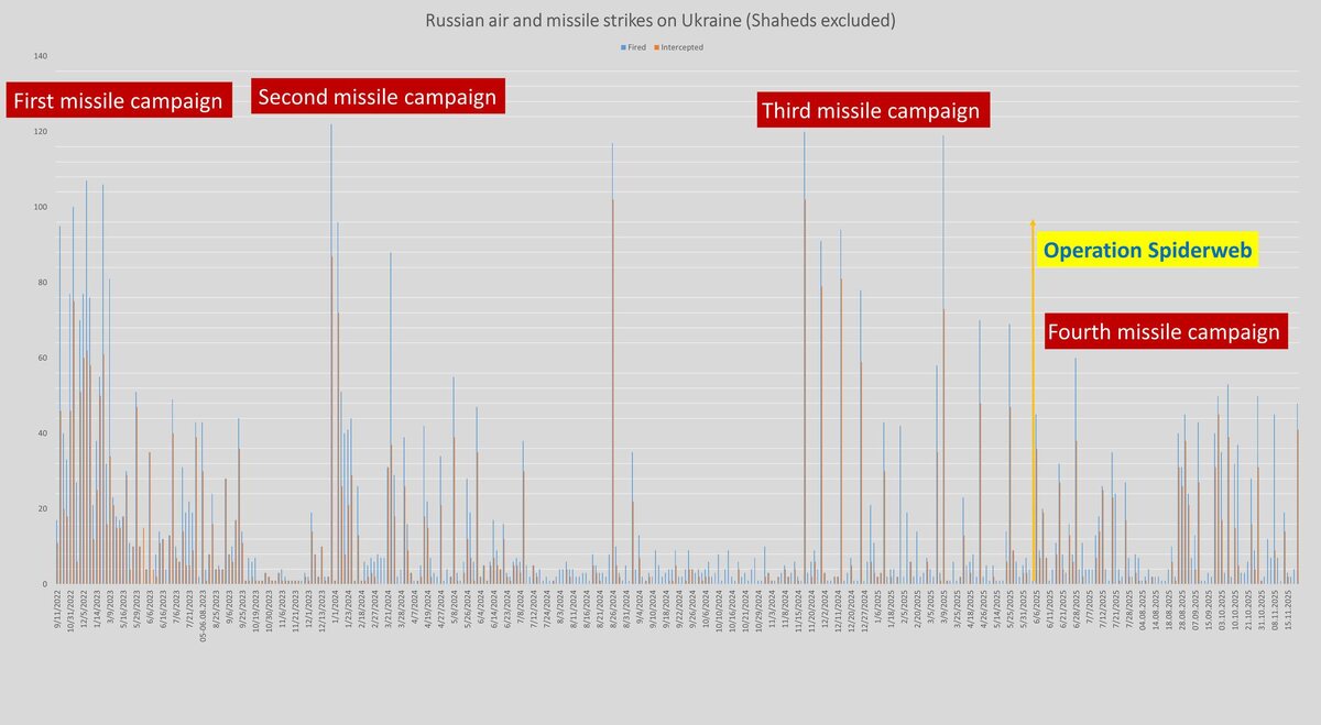 Продолжение доклада Rochan Consulting об ударах по энергетической инфраструктуре Украины: изменение тактики и характера средств поражения. Количественные данные о применении ракет и дронов показывают, что к лету 2025 года Россия фактически перестроила свой комплекс для нанесения дальнобойных ударов. После проведённой 1 июня украинской операции «Паутина» произошёл явный структурный сдвиг. До этого момента Россия регулярно запускала большие ракетные залпы, в том числе значительное количество очень крупных пакетов из 80-120 ракет. В 291 залпе до появления «Паутины» средний размер пакета составлял около 15 ракет, а медианное значение – 5. Однако это не учитывает почти 50 массированных залпов из 30 и более ракет, в среднем более 60 ракет в каждом. В 13 из них было более 80 ракет, что соответствует типичным запускам 90-120 ракет в 2022-2024 годах. После 1 июня 2025 года эта закономерность полностью исчезает. В 83 залпах общий средний размер немного уменьшается примерно с 15,3 до 14,3 рак