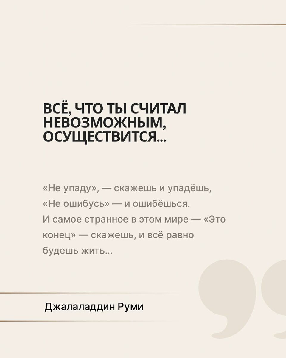 «Бог говорит: «Кого бы ты ни полюбил сильнее Меня, того Я заберу у тебя…». И ещё: «Не говори: не проживу без него» — Я сделаю так, что проживёшь. Сменится время года, ветки деревьев, некогда дававшие тень, высохнут, терпение иссякнет, та любовь, что ты считал искренней, покинет тебя, ты будешь в замешательстве. Твой друг обернётся врагом, а враг вдруг станет другом — вот таков этот странный мир. Всё, что ты считал невозможным, осуществится… «Не упаду», — скажешь и упадёшь, «Не ошибусь» — и ошибёшься. И самое странное в этом мире — «Это конец» — скажешь, и всё равно будешь жить…» . Джалаладдин Руми
