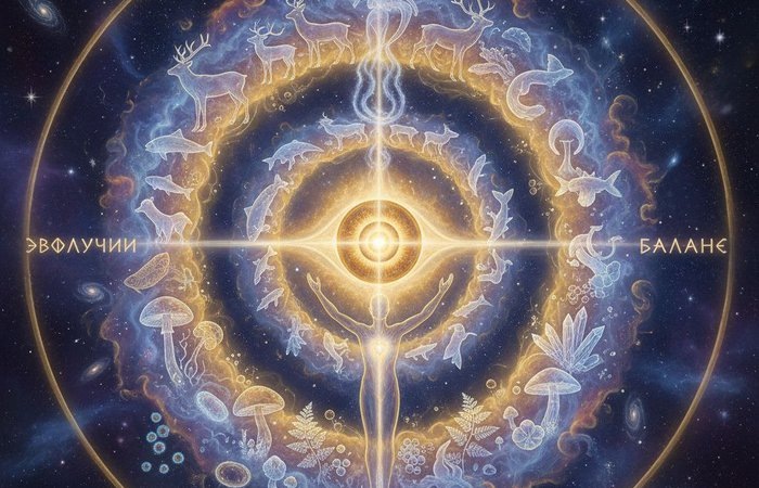 "ЭВОЛУЧИЕ" — процесс становления, раскрытия и преобразования через эти универсальные потоки сознания и энергии. Оно о том, как разные Лучи (разные энергии и типы жизни) должны гармонично взаимодействовать, а не исключать друг друга. Как каждая форма жизни, потребляя энергию, участвует в восхождении этой энергии по Лучам, делая её всё более чистой и осознанной. Божественные потоки, которые питают и формируют этот процесс. В пищевой цепочке каждое звено преобразует и возвышает энергию, которую оно потребляет, доводя её до более чистого, высокочастотного состояния.