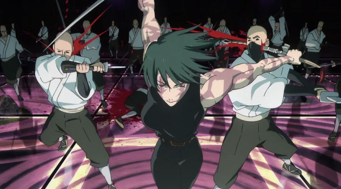 Первое, что хочу отметить, – как здесь поставлен экшен. В отличие от большинства сёнэнов, сцена не тонет в эффектах и рваном монтаже. Камера почти всегда держит географию боя: понятно, кто где стоит, откуда наносится удар и как он достигает цели. Это ближе к киношной хореографии, чем к типичному аниме-монтажу, где движение часто подменяется хаотичными вспышками. Такой подход сразу роднит серию с культовым «Убить Билла». Более того, отсылки доходят до прямого визуального цитирования: некоторые сцены практически повторяют кадры и цветовые приёмы Тарантино.