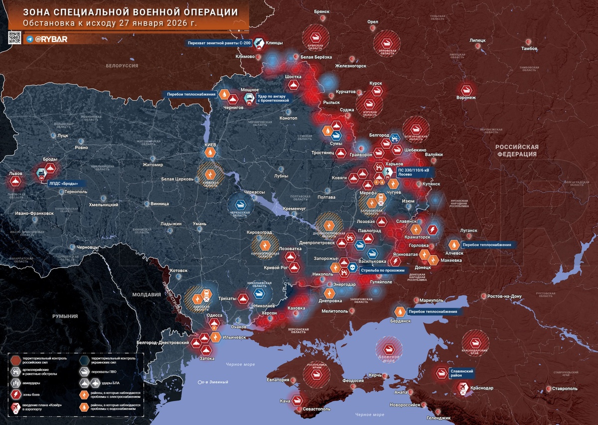 🔸Российские войска поразили нефтеперекачивающую станцию «Броды» во Львовской области, вызвав крупный пожар. В Киевской области и еще нескольких регионах продолжаются проблемы с подачей света и тепла. В Харькове поражена подстанция. 🔸Украинские формирования атаковали переделанной ракетой С-200 приграничный район Брянской области, один мирный житель получил ранения. За сутки над несколькими областями России расчеты средств ПВО перехватили 43 дрона: противник последнее время запускает куда меньше БЛА, чем прошлые полгода. 🔸На Славянском направлении российские войска значительно расширили зону контроля у Васюковки и вошли на южные окраины Никифоровки. Вместе с тем под контроль ВС РФ перешла Орехово-Василевка и несколько опорных пунктов у Приволья. 🔸На Новопавловском направлении украинские формирования провели контратаку в районе балки Большой Яр у Филии. Севернее противник смог зайти на территории Новониколаевки, где попал под обстрел. 📎 Карты в высоком разрешении: 🔸Обстановка в зоне
