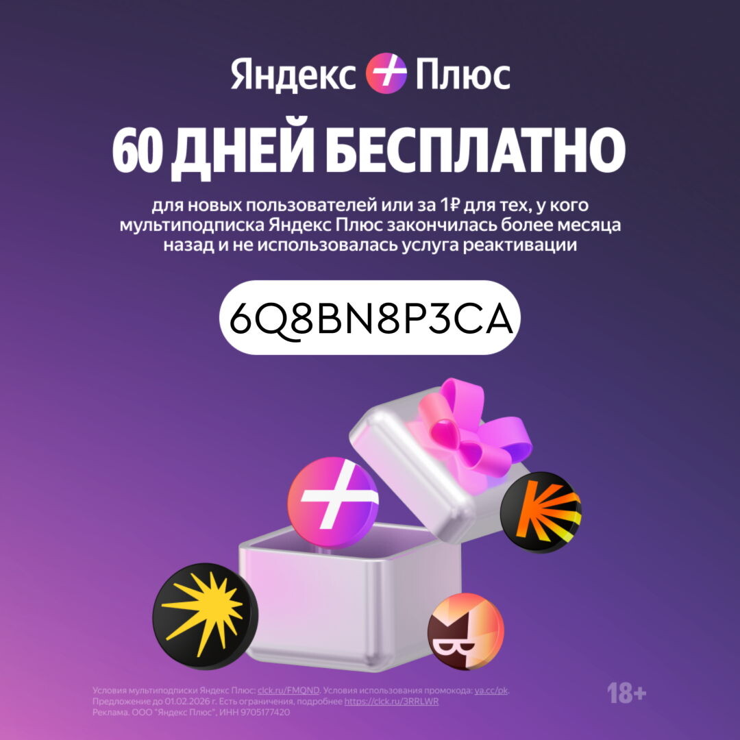 Решил поделиться с вами отличным промокодом на подписку Яндекс Плюс. С помощью него новым пользователям будет доступной 60 дней бесплатной подписки, а старым (если у вас нет активной подписки) также будет доступно 60 дней. Яндекс Плюс — это мультиподписка от Яндекса, объединяющая доступ к развлечениям, контенту и скидкам в экосистеме сервисов. Она дает полный доступ к музыке, фильмам, книгам и бонусам без рекламы за фиксированную цену. Не успукайте возможность воспользоваться возможностью получить 60 дней бесплатной подписки, вместо 45 дней. 👍🏻 6Q8BN8P3CA Промокод на 60 дней доступа к Яндекс Плюс бесплатно для новых пользователей или 60 дней за 1 ₽ для пользователей без активной мультиподписки Применить промокод Подписка предоставляет неограниченный доступ к Яндекс Музыке (миллионы треков, подкасты, оффлайн-загрузка в Hi-Fi качестве) и Кинопоиску HD (фильмы, сериалы, спорт без рекламы, скидки на аренду).