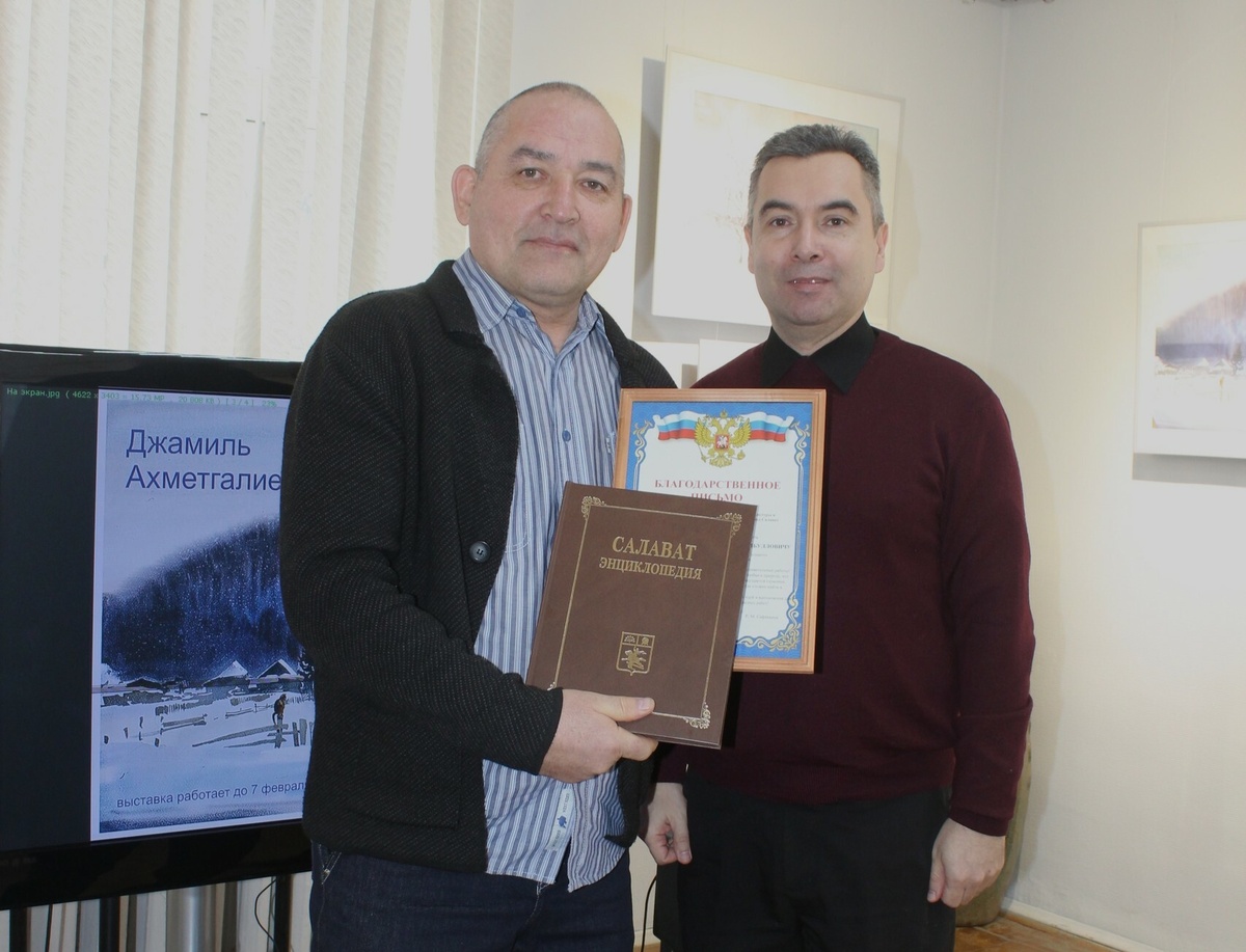 Директор МБУ К и И «Наследие» Руслан Сафиканов вручил Джамилю Ахметгалиеву Благодарственное письмо и энциклопедию о городе Салавате.