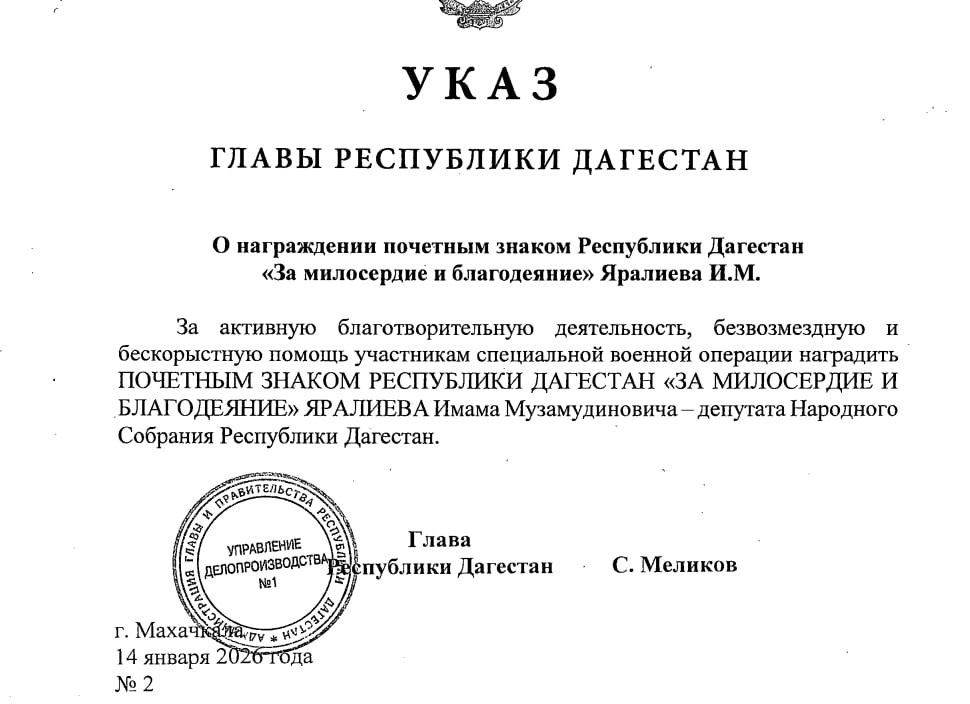 ". Соответствующий указ подписал Глава РД Сергей Меликов. Награждение обосновано деятельностью Яралиева, связанную с "безвозмездной, бескорыстной помощью участникам СВО". Подписаться на "Черновик" 2.0 | Обратная связь: @chernovik_1_bot