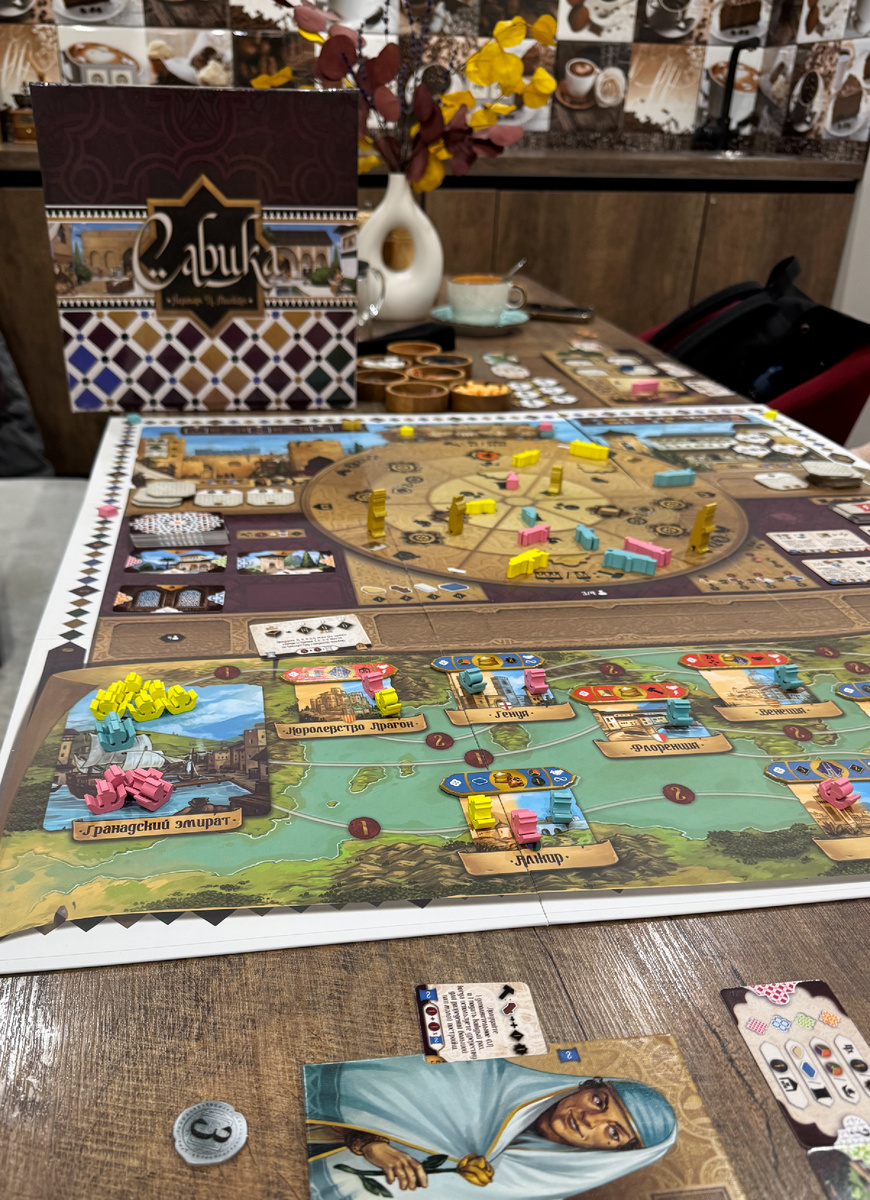 Тем не менее за рубежом у игры довольно высокие рейтинги — и она, на мой взгляд, играется для своей ниши ладно и довольно конкурентно для евро: нужно успевать и города быстрее соперников посещать, и клетки на ронделе занять, чтобы целое состояние за это не выкладывать, и постройки у оппонентов увести.