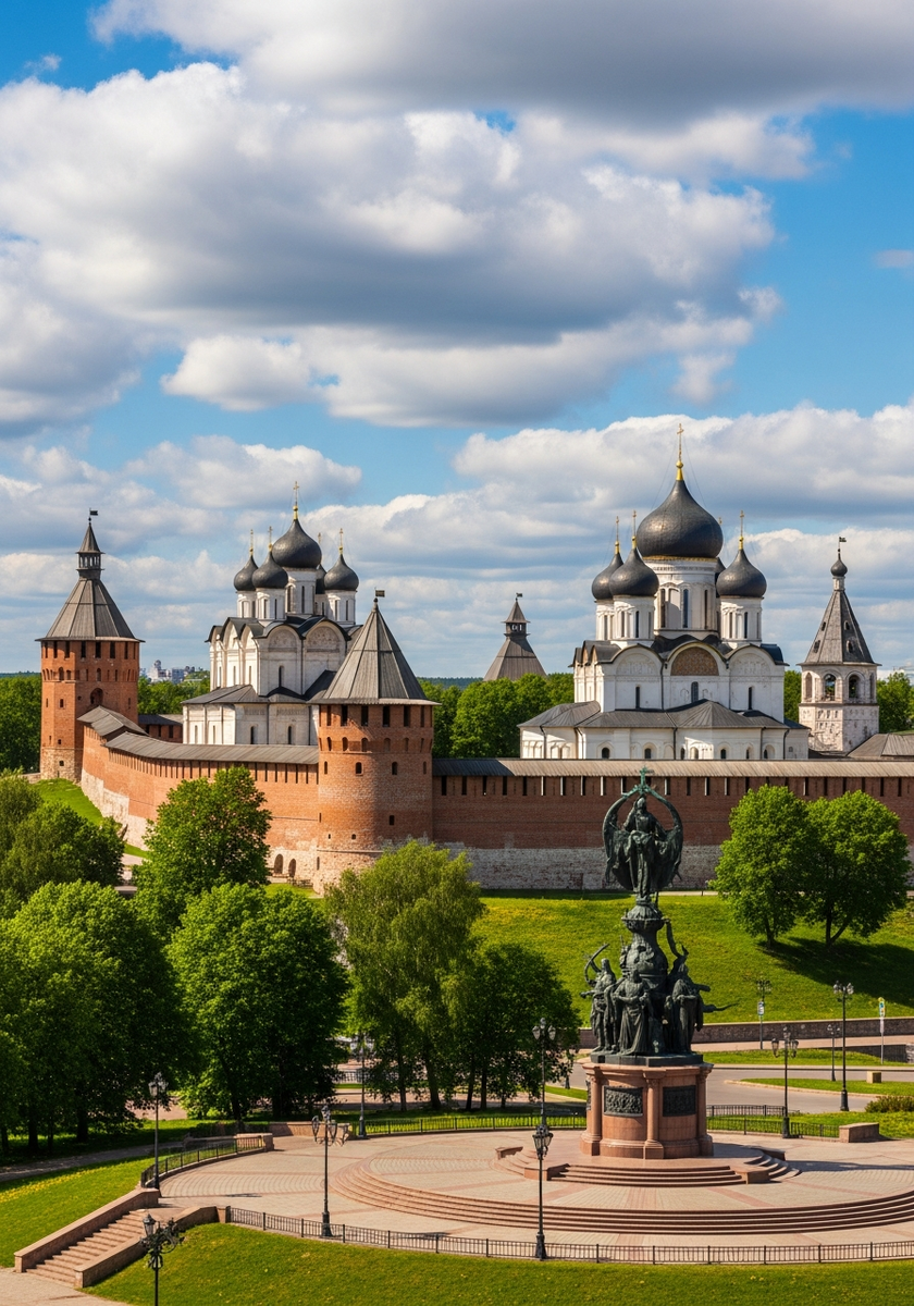 Внутри можно увидеть Софийский собор, памятник "Тысячелетие России", Грановитую палату и несколько музеев с уникальными экспозициями древнерусского искусства и берестяных грамот. Прогулка по крепостным стенам открывает захватывающие виды на город и реку.