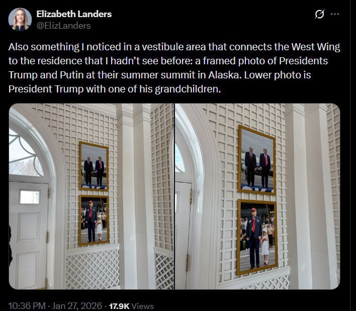 📸 Американская журналистка Элизабет Ландерс сообщила, что в вестибюле Белого дома на стену повесили фотографию Дональда Трампа и Владимира