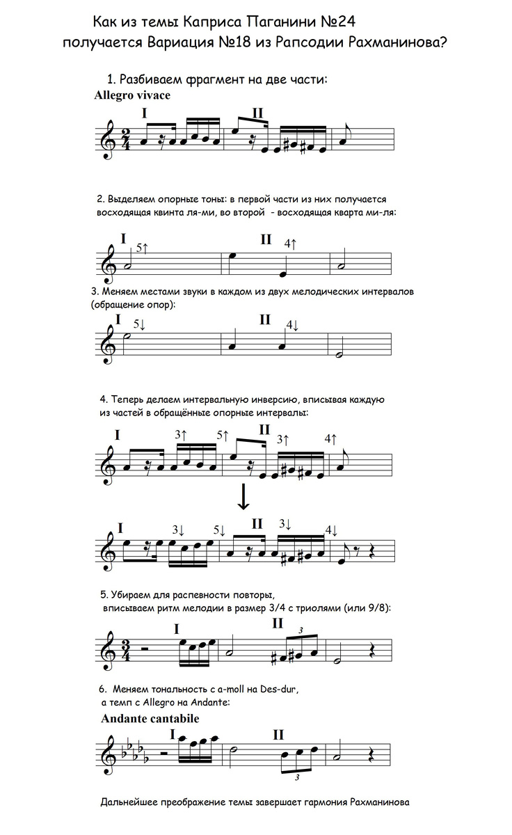 Немного о самой знаменитой музыке, написанной в девятидольном метре (записанном как 3/4 триолями). Это Вариация XVIII из "Рапсодии на тему Паганини" Рахманинова. Из максимально простой и динамичной темы получается медленная и крайне выразительная лирическая мелодия, а тема каприса преображается до своей противоположности. Проследим, какие именно трансформации произошли с начальным мотивом Паганини.