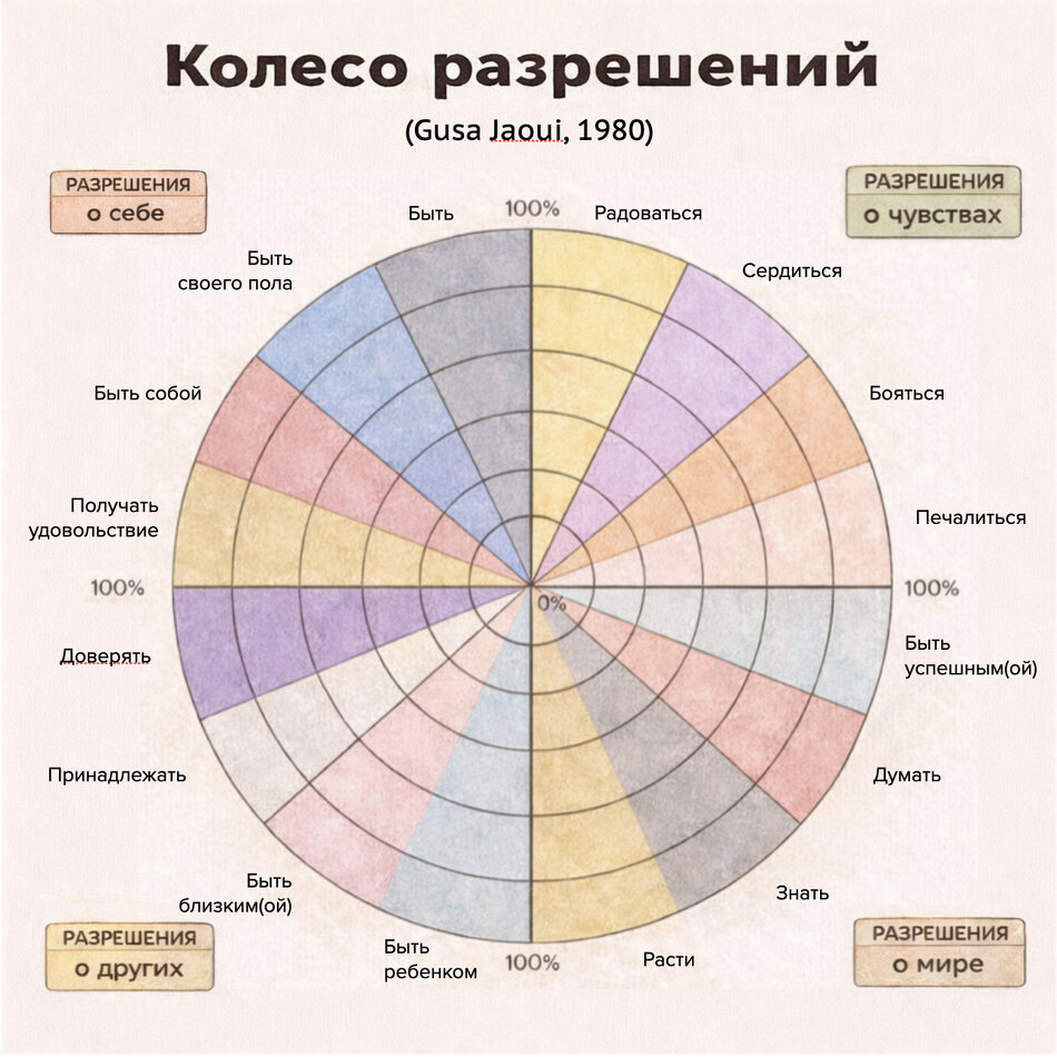 Одну из наглядных моделей этой темы предложила Сюза Жауи (Cysa Jaoui) — «Колесо разрешений». Эта схема помогает увидеть, в каких сферах жизни человеку внутренне “можно”, а где — хронически “нельзя”, даже если внешне он выглядит успешным, взрослым и функциональным. Разрешения — это не про вседозволенность. Это про внутреннее право: чувствовать то, что чувствуешь; быть живым, уязвимым, несовершенным; хотеть, выбирать, отказываться; нуждаться в других и одновременно быть автономным. Большинство этих прав формируется очень рано, в детских отношениях со значимыми взрослыми — не столько через слова, сколько через опыт. Колесо разделено на четыре сектора. Каждый из них отражает отдельную зону психологической жизни. Сюда относятся базовые экзистенциальные права: быть собой; быть своего пола; быть здоровым (и болеть); получать удовольствие; быть успешным. Если здесь много внутренних запретов, человек может: постоянно сомневаться в себе; стыдиться желаний; обесценивать достижения; жить с ощущени