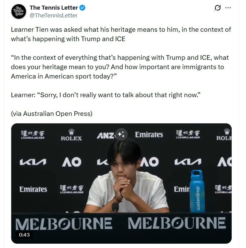 Теннисиста Лирнера Тиена спросили, что для него значит его наследие в контексте ситуации с Трампом и ICE (иммиграционная и таможенная