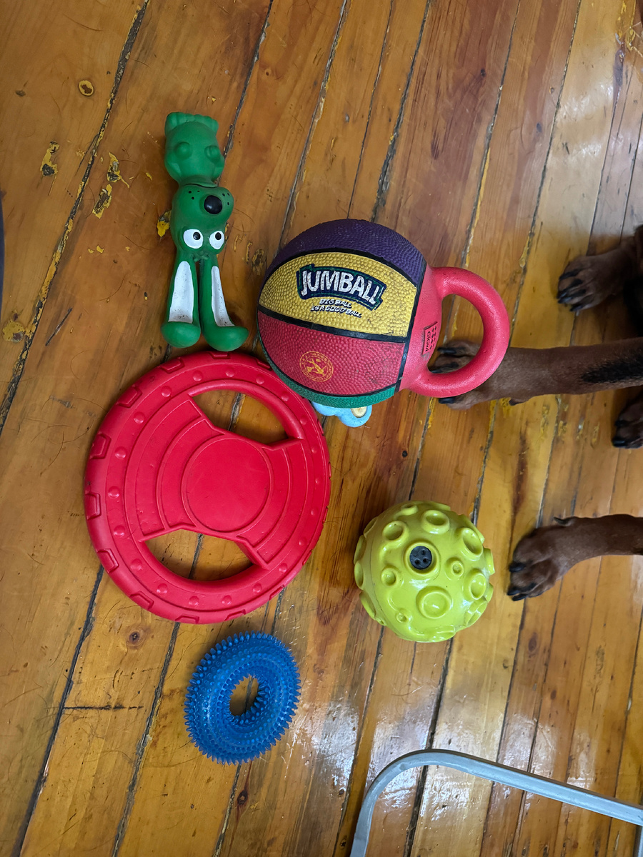 В щенячьем возрасте не стоит брать очень жесткие игрушки, лучше выбрать что- нибудь по мягче, и важно учитывать вес игрушки. Мы для Дори в щенячьем возрасте предпочитали брать мягкие мячики, различные канаты и различные игрушки из мягкой резины с пищалками. Зубки у щенков очень острые и игрушки портятся быстро, поэтому у нее в наличии всегда были 2 игрушки, и как только она их прогрызала, мы меняли на другие. Стала замечать, что покупая некоторые игрушки, которые интересны могли бы быть на мой взгляд, Дори не интересовали вообще или она их просто боялась. Тогда мы начали ходить с ней ЗОО магазин вместе и она сама выбирала себе игрушки. Да, да, собаки четко знают что их интересует, потому что из большой кучи игрушек, ковыряясь в ней она выбирала именно одну и сразу с ней убегала. Чем взрослее становилась Дори, тем больше мячиков у нас появлялось в доме. Вот несколько ее любимых.