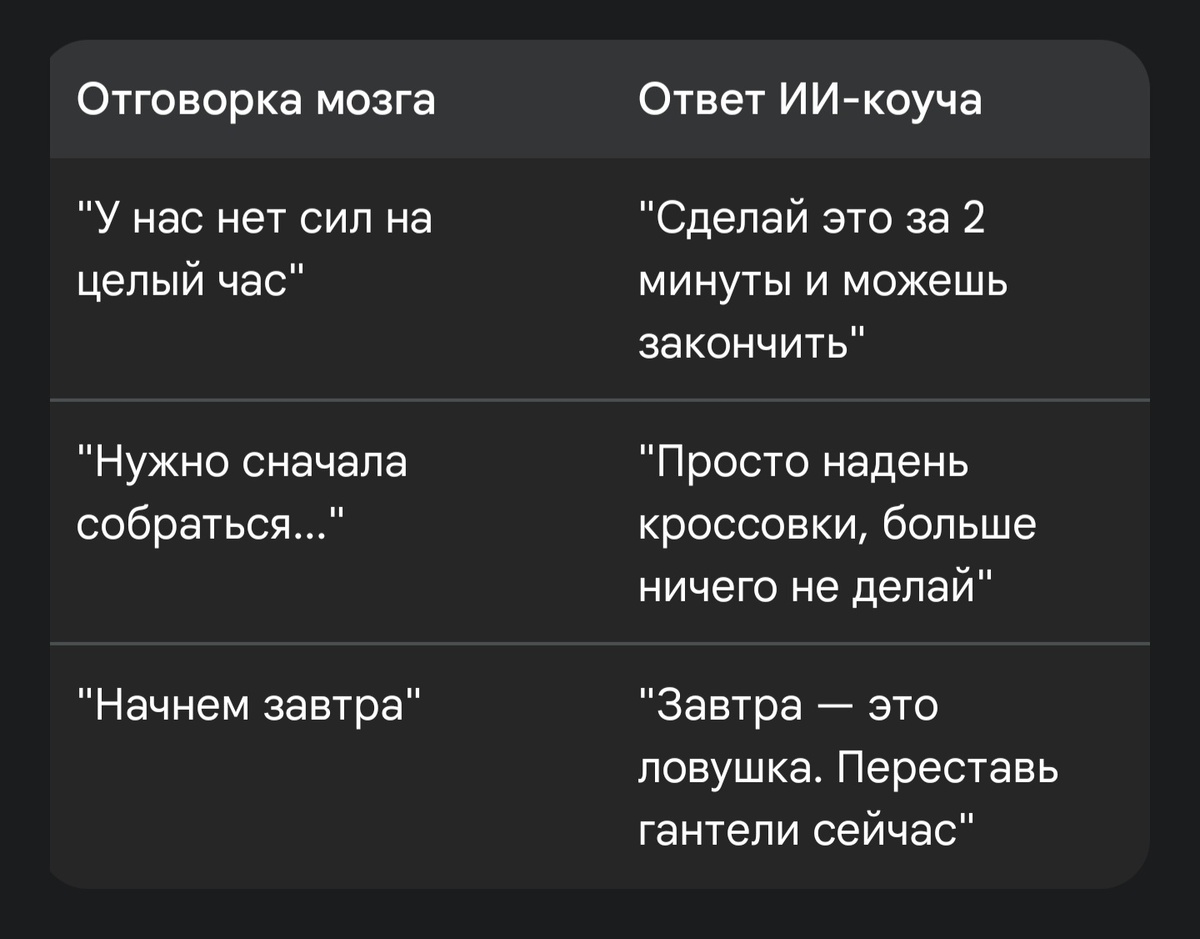 Когда я применил этот промт на себе, ИИ не просто сказал «иди тренируйся». Он выяснил, что меня пугает сама необходимость переодеваться и тратить целый час.