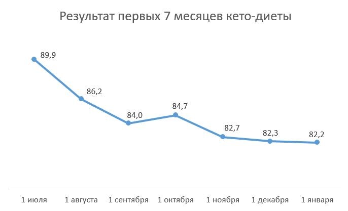 В плане снижения веса, 7 месяцев соблюдения кето-диеты (с превышением нормы углеводов, отпуска и срывов на сладкое) у меня выглядят так: